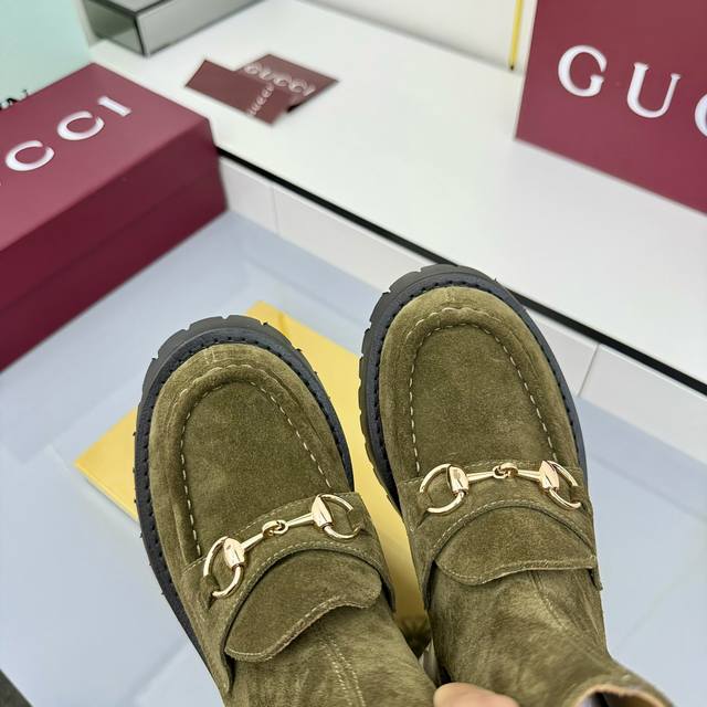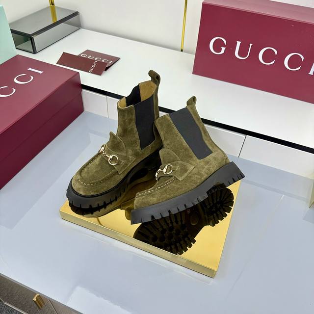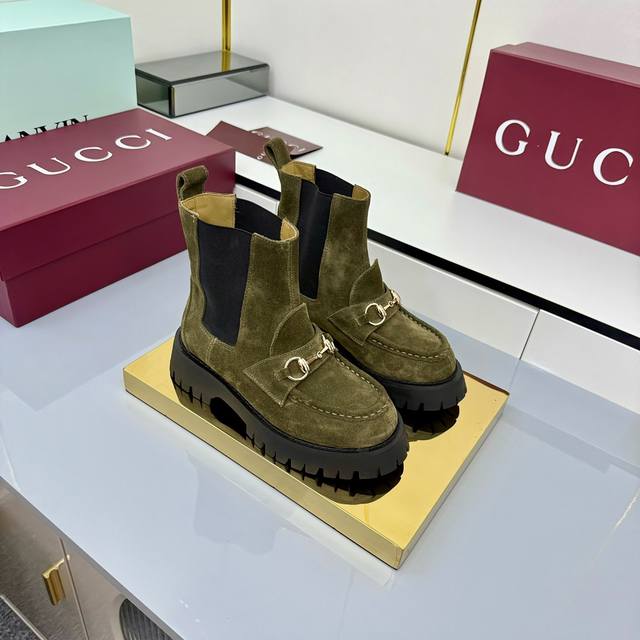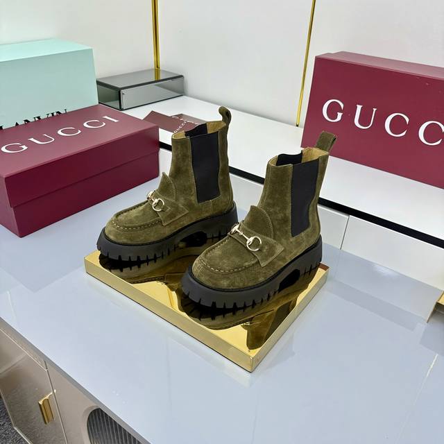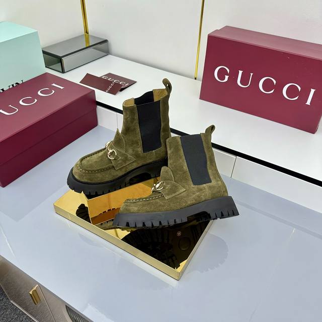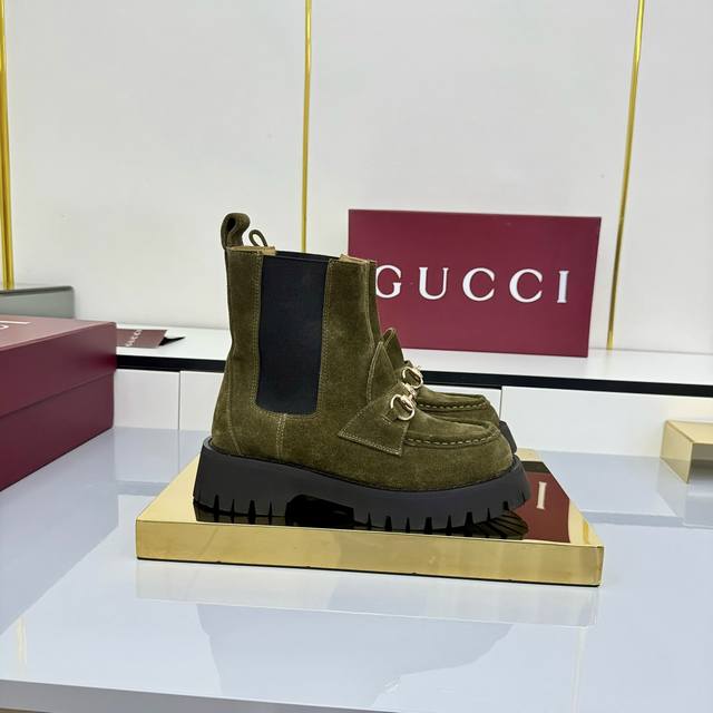 2025-Gucci这款马衔扣踝靴采用经典短靴版型,将典藏设计与现代精髓合而为一。这款靴子采用特有的瘦窄版型,以咖啡色绒面材质匠心打造,意在致敬品牌设计传承。 女士 浅金色调配件 马衔扣 橡胶鞋底 平底35-41 跟高:1.5厘米