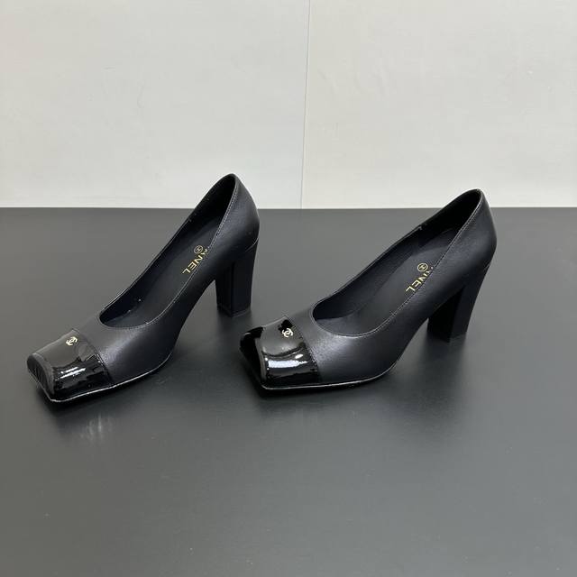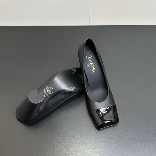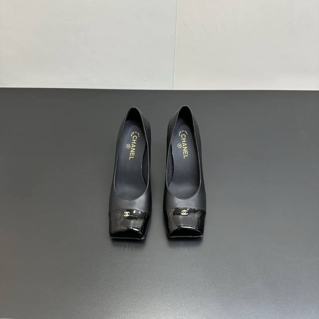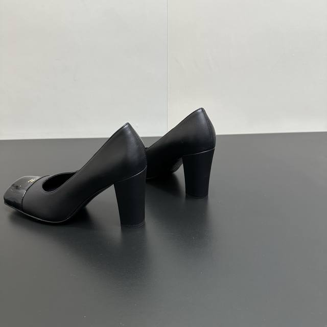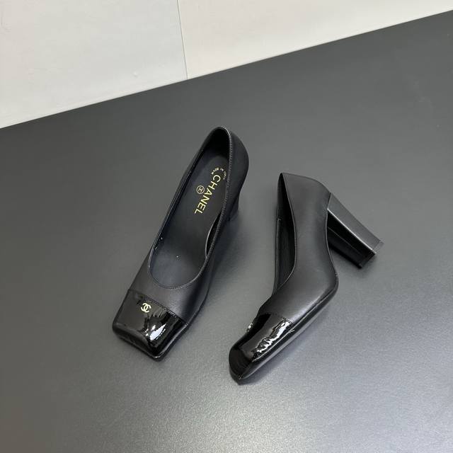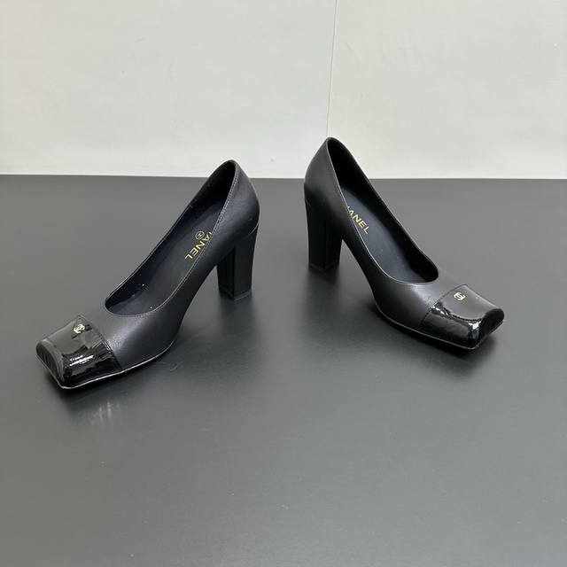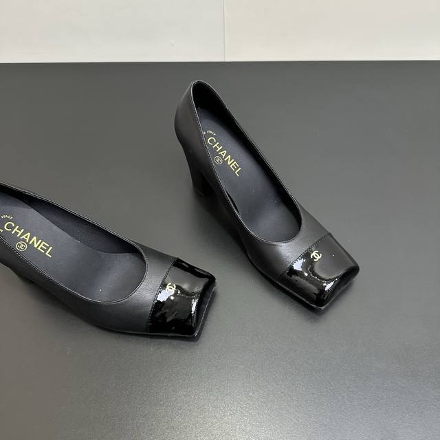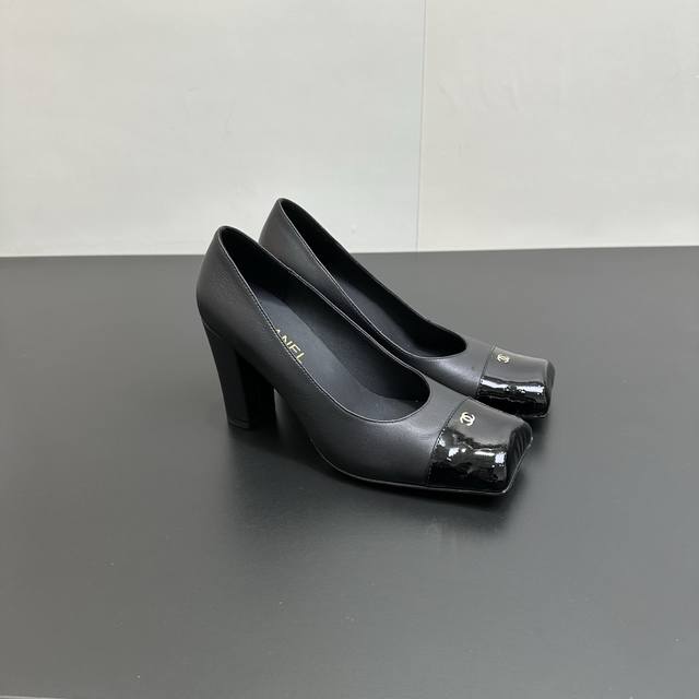 2025Ss Chanel香奶奶香奈儿粗跟拼接高跟单鞋 经典方头轮廓,流畅利落,适配多种风格穿搭。鞋身点缀标志性双C Logo,细节之处彰显奢华质感 。适中的粗