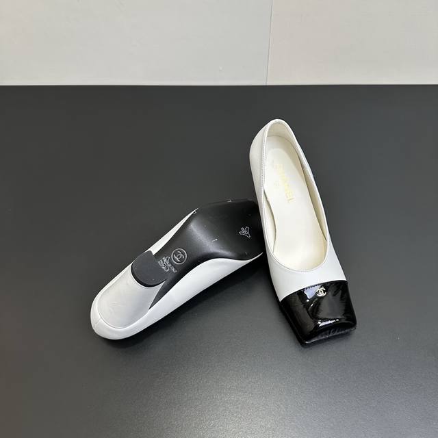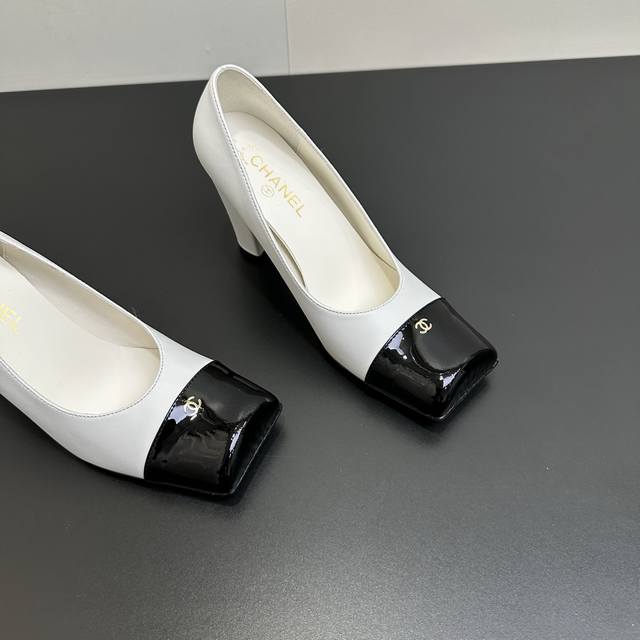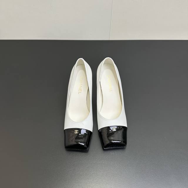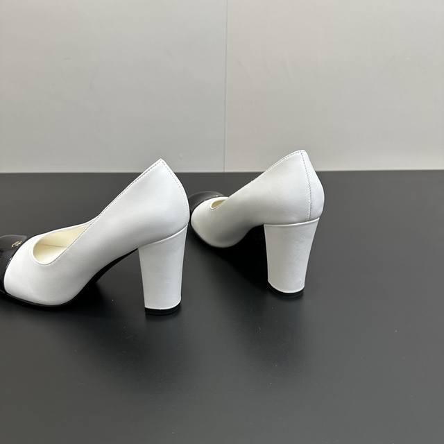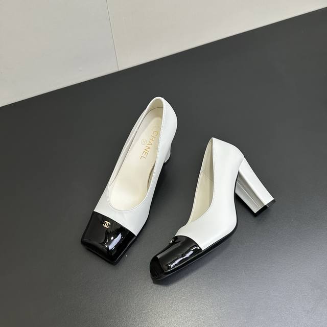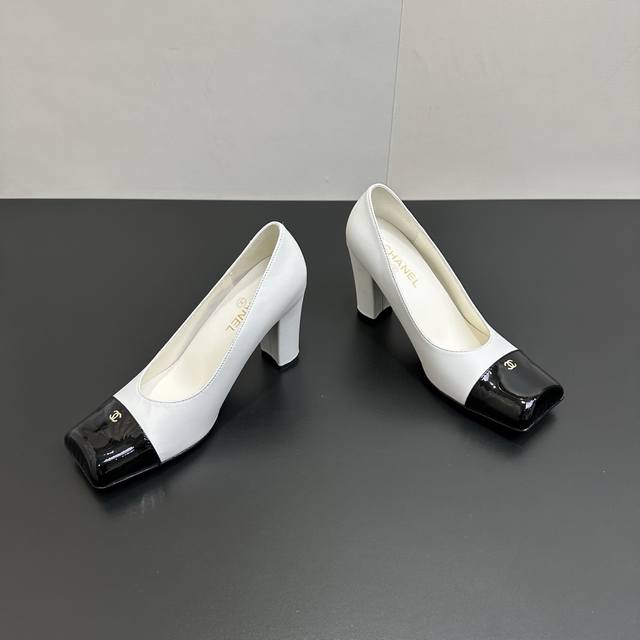 2025Ss Chanel香奶奶香奈儿粗跟拼接高跟单鞋 经典方头轮廓,流畅利落,适配多种风格穿搭。鞋身点缀标志性双C Logo,细节之处彰显奢华质感 。适中的粗