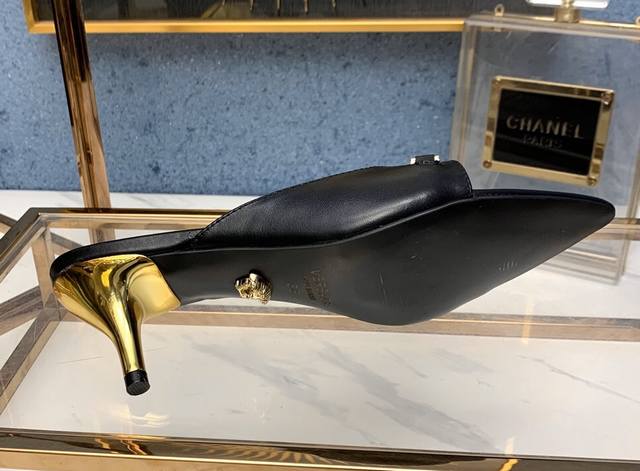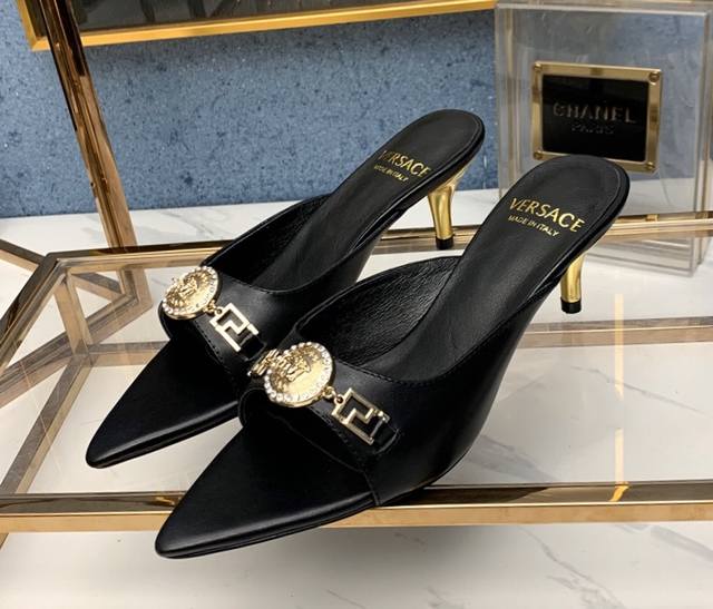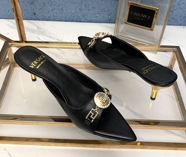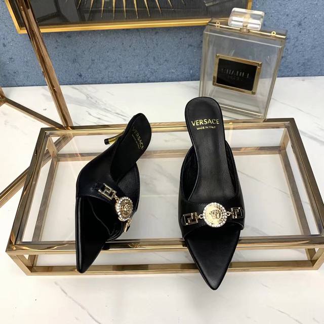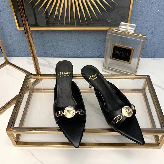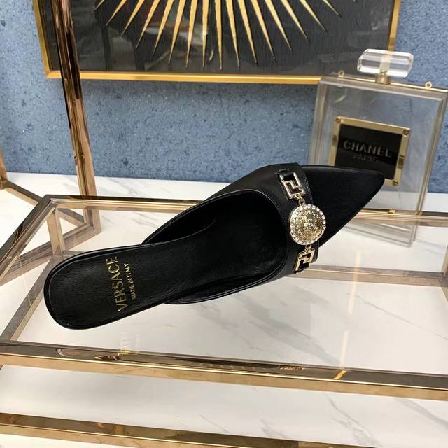 35-42码,出厂 范思哲新款矮跟凉拖鞋,面料牛皮,内里垫脚包边全羊皮,橡胶大底,跟高6Cm,时尚舒适,穿脱方便。