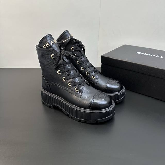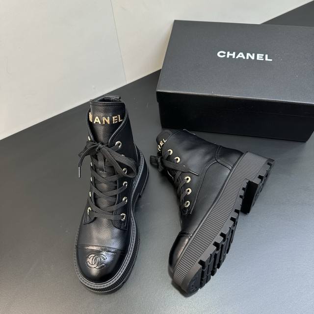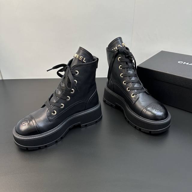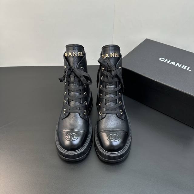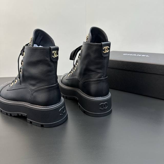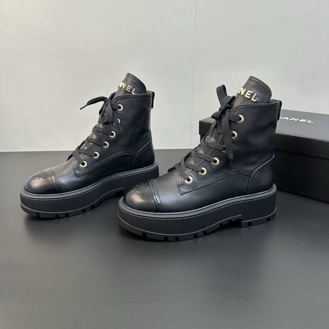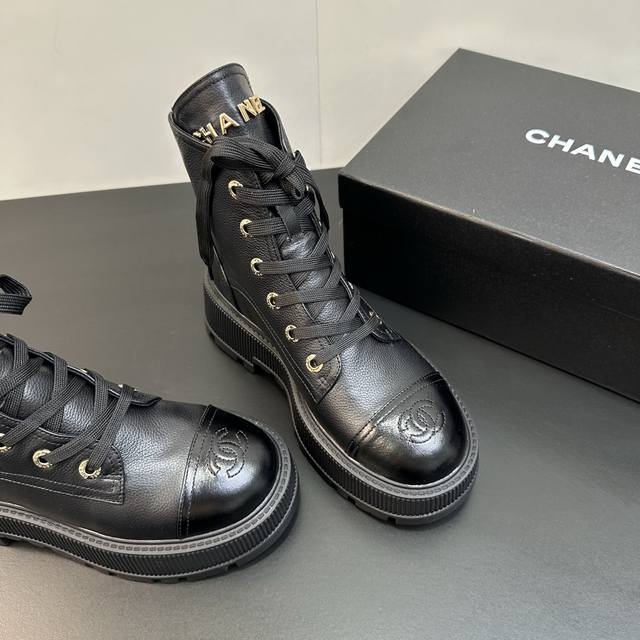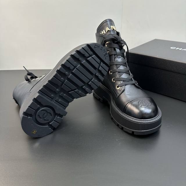 Chanel香奈儿小香2025秋冬羊皮系带短靴新品 版型也香家马丁靴基础版型,利落帅气 鞋面用了牛皮,超级柔软的贴肤感,挺阔饱满,帅气拿捏! 内里柔软水染小羊皮