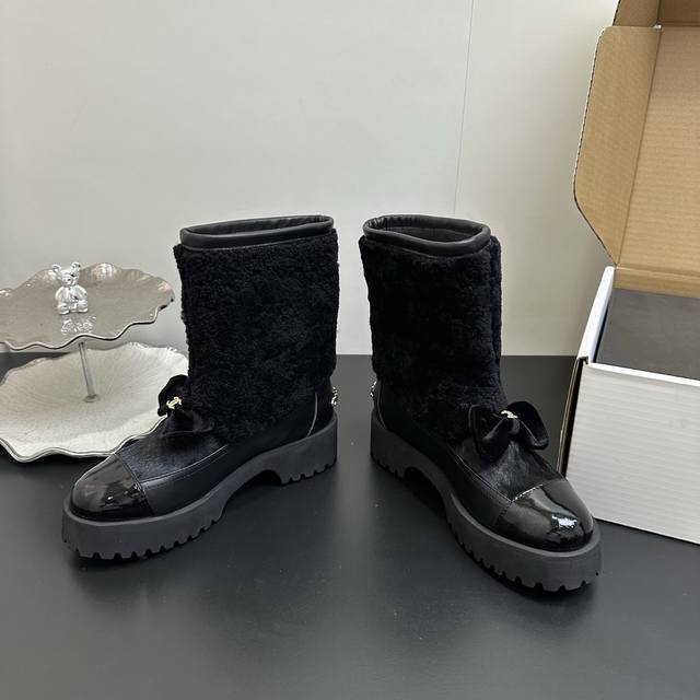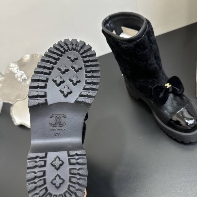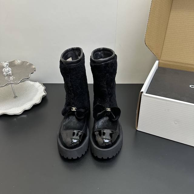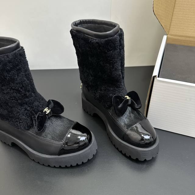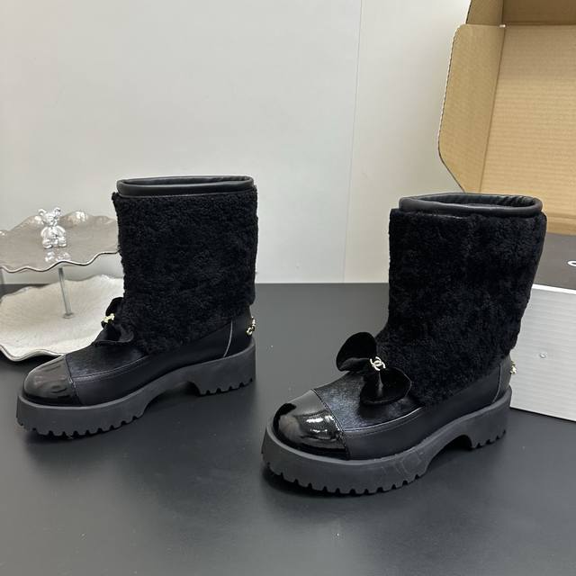 Chanel香奈儿 秋冬经典款 小香拼接羊毛羊羔毛短靴短筒厚底雪地靴 可帅气可温柔的小香靴子 ,搭配羊毛靴筒 设计真的绝绝子 ,看起来就是不一般的短靴靴筒笔直有型且不失柔软度 也不挑人,加上精致蝴蝶结点缀 高级大气 不俗气。上脚酷酷的特有范儿 还特显腿长哦 鞋面:马毛搭配羊皮,羊毛 内里垫脚:羊皮 鞋底:组合大底 筒高19Cm 码数:35-39 40.41定做不退换