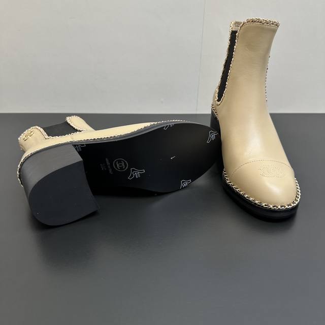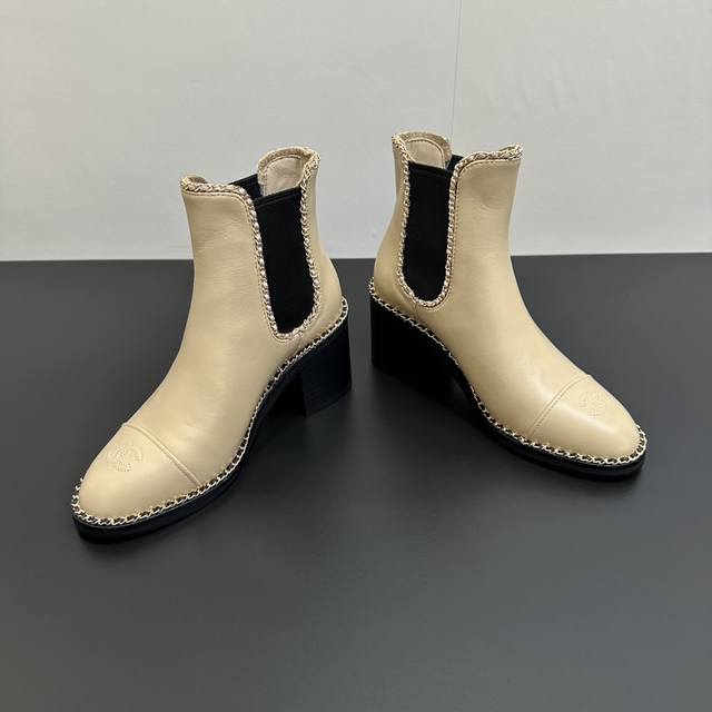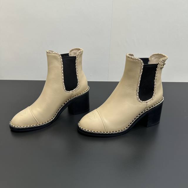 Chanel香奈儿25Ss 新款秋冬高跟链条松紧短靴 ,楦型百搭瘦脚Yyds.造型立体饱满,上脚舒适 气场十足,橡筋一脚蹬 易穿搭 经典链条五金 高级优雅 鞋面:羊皮 内里:羊皮 鞋底:真皮底 Size: 35-39 40.41定