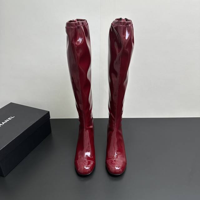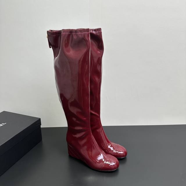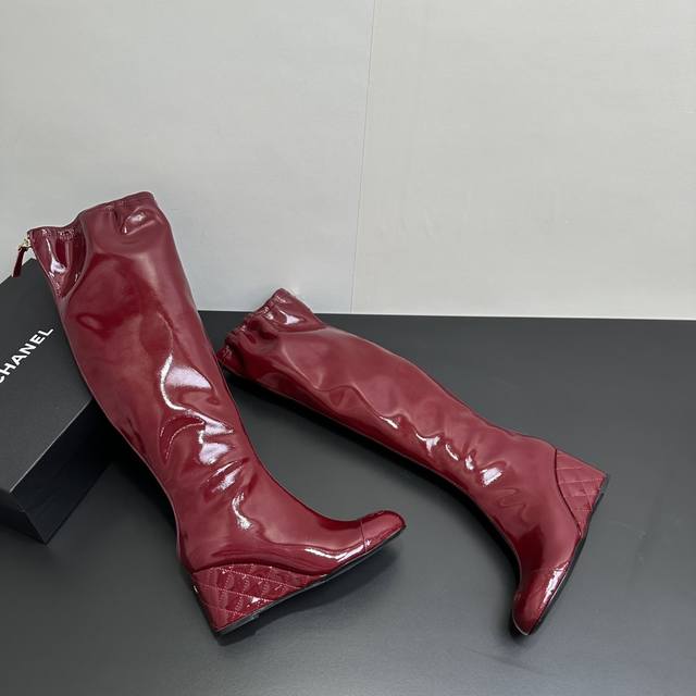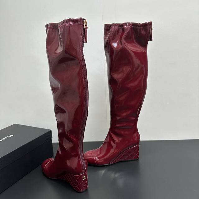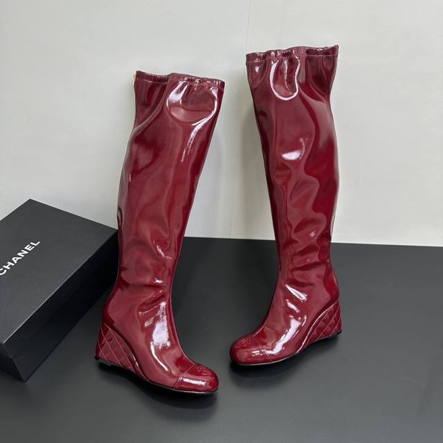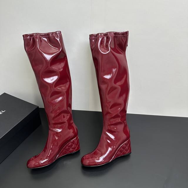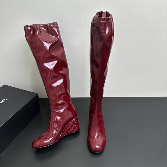 Chanel 香奈儿小香25A 秋冬新款双C菱格坡跟弹力靴过膝长靴漆皮亮面后拉链长靴 鞋头标志性电绣双C标志低调闪耀,不仅是身份象征 更彰显著独特的时尚态度。弹力材质巧妙拼接 贴合腿部曲线,既保证活动自如 又增添几分随性灵动。坡跟设计精妙 高度恰到好处既提供稳健支撑 又能拉长腿部线条轻松打造大长腿视觉效果! 鞋面:定制弹力皮 內里垫脚:贴合弹力莱卡 羊皮 鞋底:意大利真皮大底 跟高:7Cm 筒高46.5Cm 小腿围36Cm 码数:35-39 40.41定做不退换
