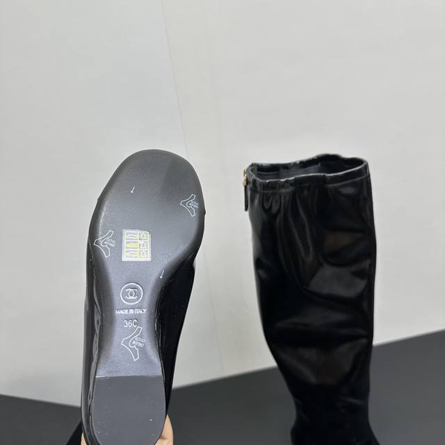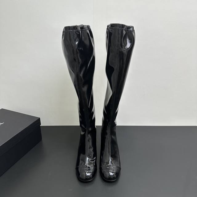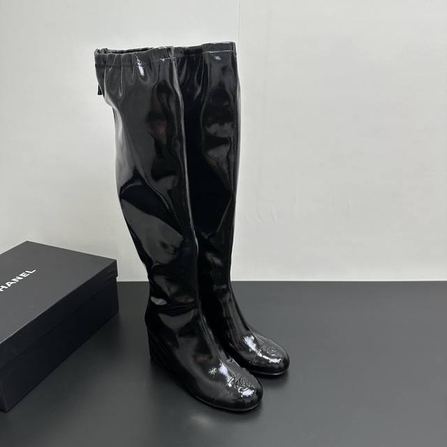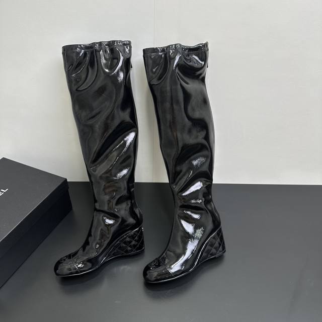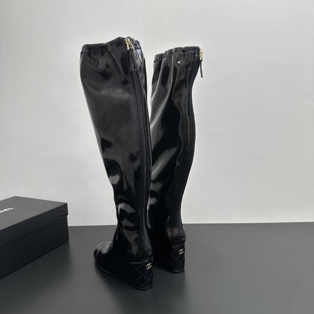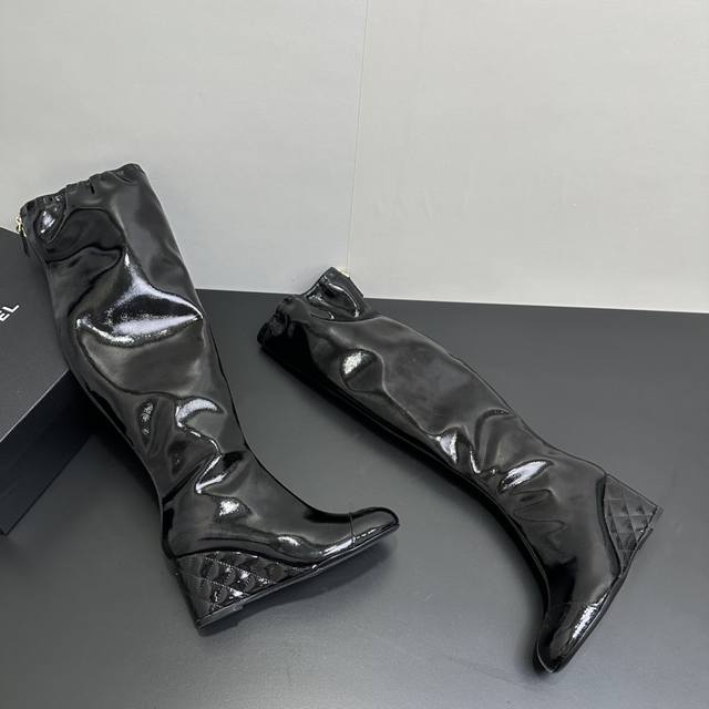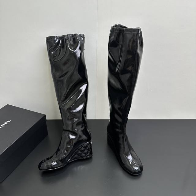 Chanel 香奈儿小香25A 秋冬新款双C菱格坡跟弹力靴过膝长靴漆皮亮面后拉链长靴 鞋头标志性电绣双C标志低调闪耀,不仅是身份象征 更彰显著独特的时尚态度。弹力材质巧妙拼接 贴合腿部曲线,既保证活动自如 又增添几分随性灵动。坡跟设计精妙 高度恰到好处既提供稳健支撑 又能拉长腿部线条轻松打造大长腿视觉效果! 鞋面:定制弹力皮 內里垫脚:贴合弹力莱卡 羊皮 鞋底:意大利真皮大底 跟高:7Cm 筒高46.5Cm 小腿围36Cm 码数:35-39 40.41定做不退换