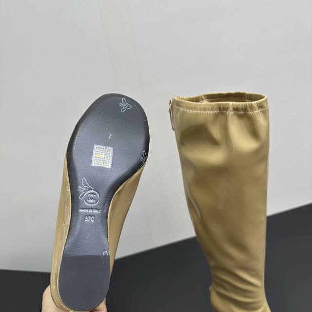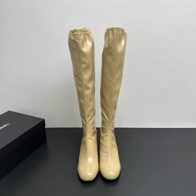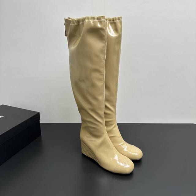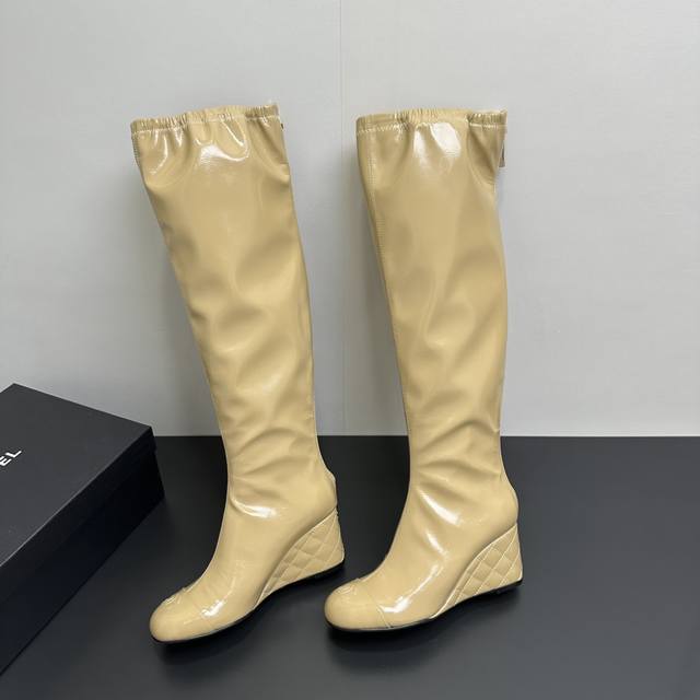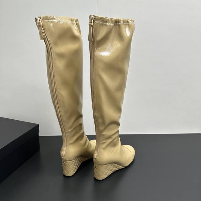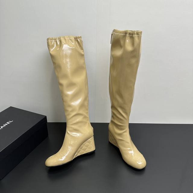 Chanel 香奈儿小香25A 秋冬新款双C菱格坡跟弹力靴过膝长靴漆皮亮面后拉链长靴 鞋头标志性电绣双C标志低调闪耀,不仅是身份象征 更彰显著独特的时尚态度。弹力材质巧妙拼接 贴合腿部曲线,既保证活动自如 又增添几分随性灵动。坡跟设计精妙 高度恰到好处既提供稳健支撑 又能拉长腿部线条轻松打造大长腿视觉效果! 鞋面:定制弹力皮 內里垫脚:贴合弹力莱卡 羊皮 鞋底:意大利真皮大底 跟高:7Cm 筒高46.5Cm 小腿围36Cm 码数:35-39 40.41定做不退换