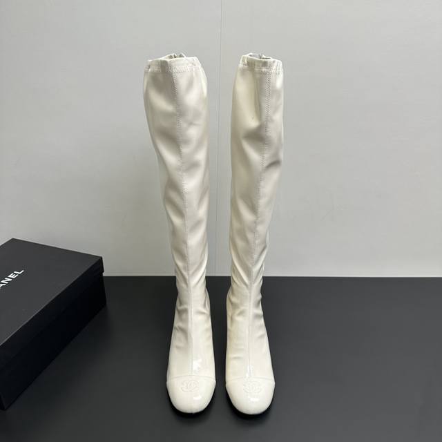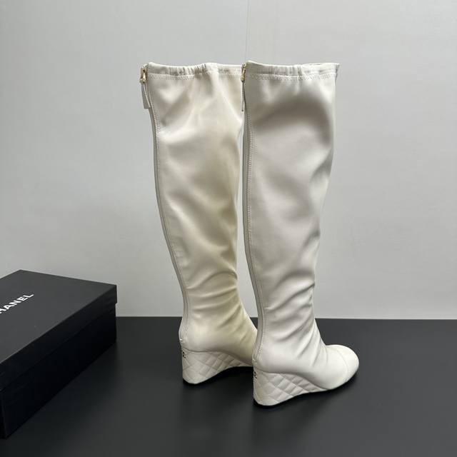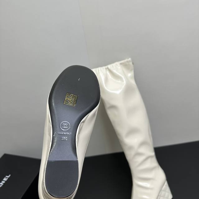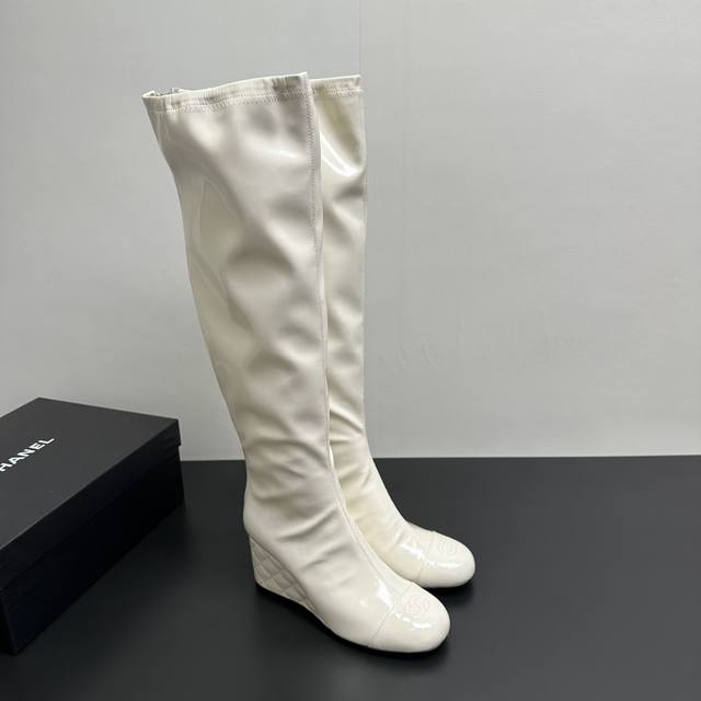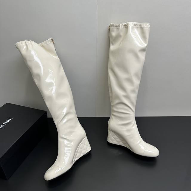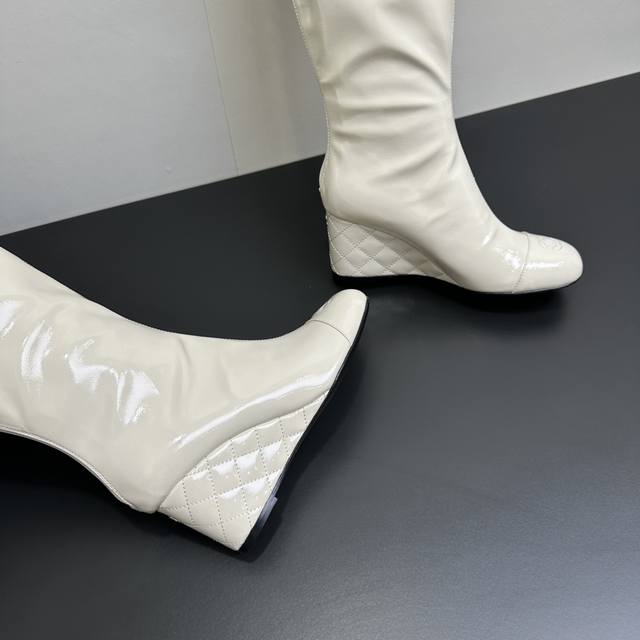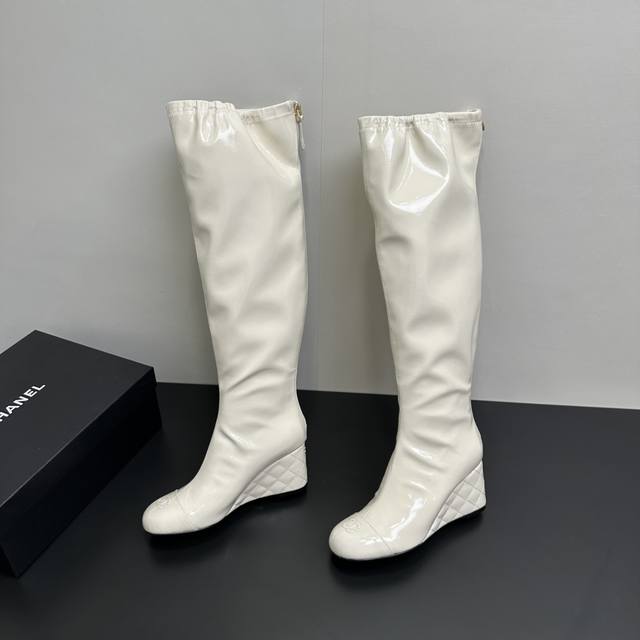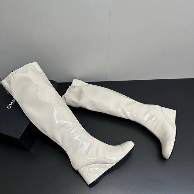 Chanel 香奈儿小香25A 秋冬新款双C菱格坡跟弹力靴过膝长靴漆皮亮面后拉链长靴 鞋头标志性电绣双C标志低调闪耀,不仅是身份象征 更彰显著独特的时尚态度。弹力材质巧妙拼接 贴合腿部曲线,既保证活动自如 又增添几分随性灵动。坡跟设计精妙 高度恰到好处既提供稳健支撑 又能拉长腿部线条轻松打造大长腿视觉效果! 鞋面:定制弹力皮 內里垫脚:贴合弹力莱卡 羊皮 鞋底:意大利真皮大底 跟高:7Cm 筒高46.5Cm 小腿围36Cm 码数:35-39 40.41定做不退换