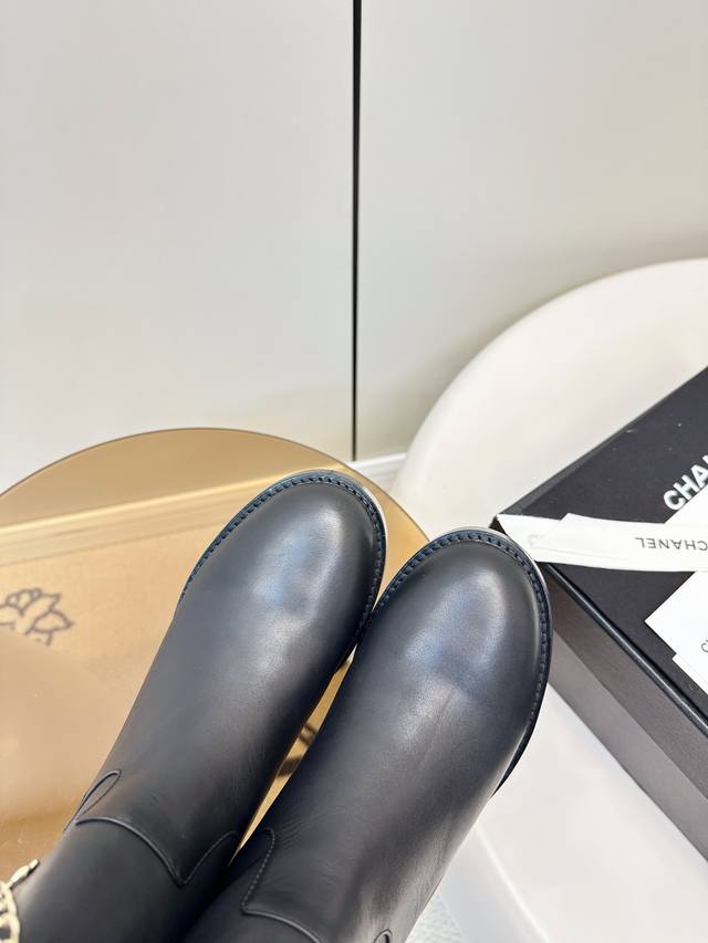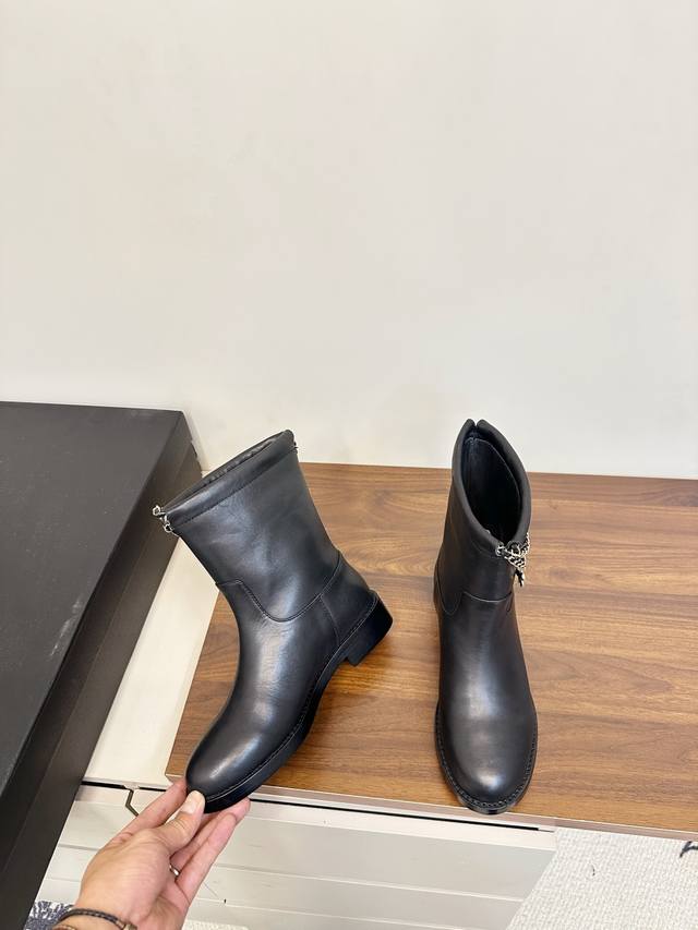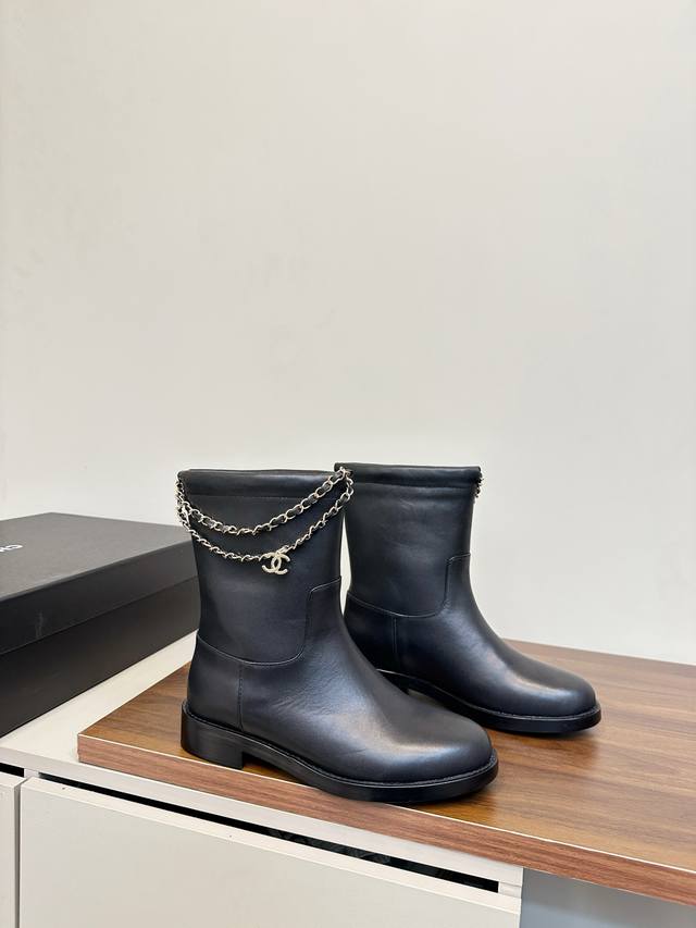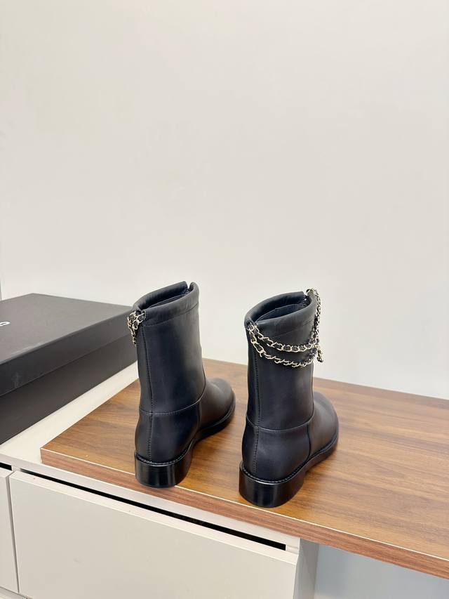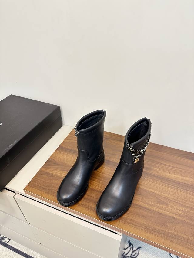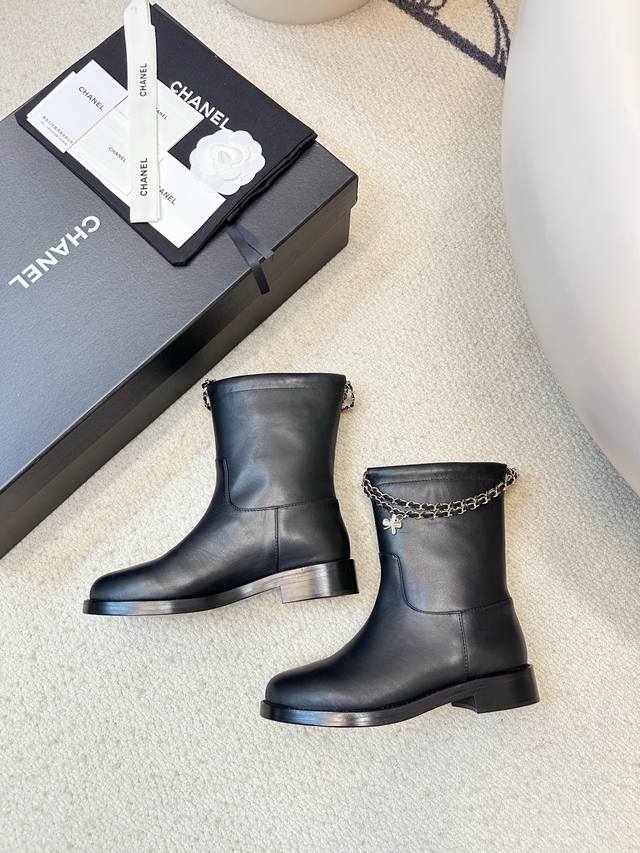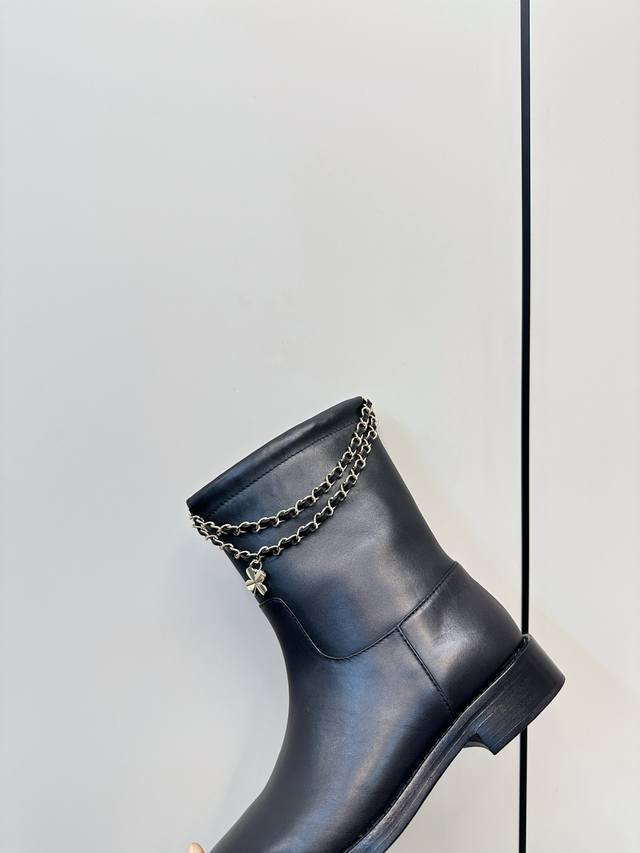 Chanel 25B四叶草 链条 麂皮短靴 Chanel 25B链条麂皮短靴,四叶草金属链条装饰,经典双C标志超有辨识度。圆头粗跟设计,舒适又时髦,秋冬穿搭无压力!内里全羊皮,柔软贴合,久穿也不累。链条细节复古摩登,牛仔裤、裙装都能轻松驾驭,优雅Or酷飒随心切换~日常通勤、休闲场合都很适合,实用又提升气质。 鞋面:鹿皮 小牛皮 内里绵羊皮内里 码数35-40 40.41订做