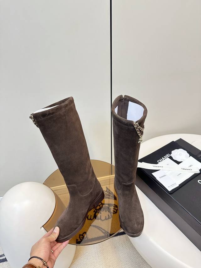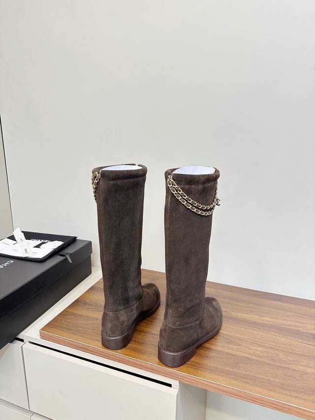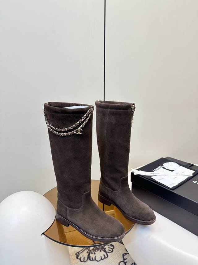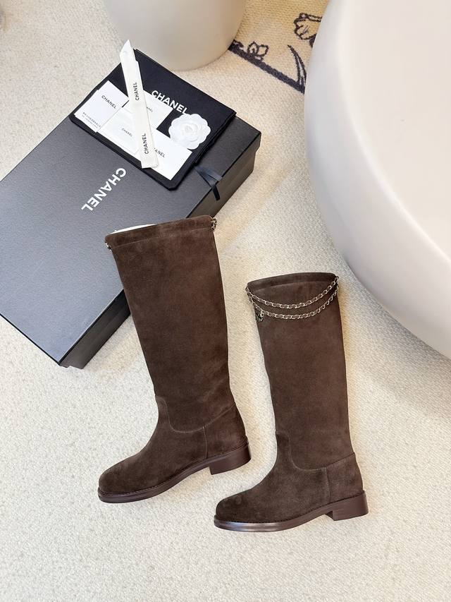 Chanel 25B四叶草 链条 麂皮 骑士靴 长靴 Chanel 25B链条麂皮短靴,四叶草金属链条装饰,经典双C标志超有辨识度。圆头粗跟设计,舒适又时髦,秋冬穿搭无压力!内里全羊皮,柔软贴合,久穿也不累。链条细节复古摩登,牛仔裤、裙装都能轻松驾驭,优雅Or酷飒随心切换~日常通勤、休闲场合都很适合,实用又提升气质。 鞋面:鹿皮 小牛皮 内里绵羊皮内里 码数35-40 40.41订做