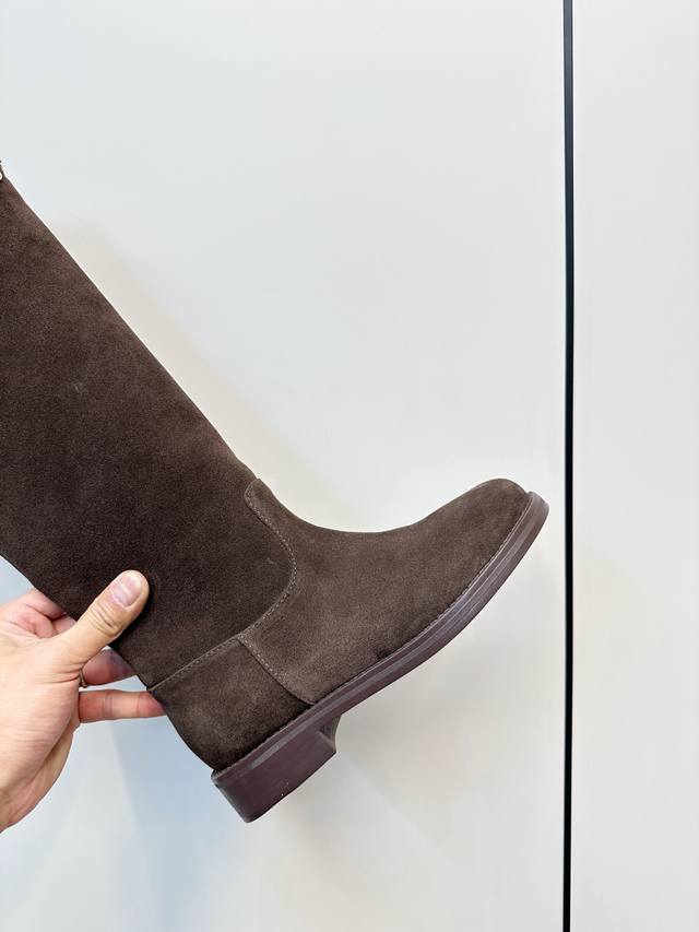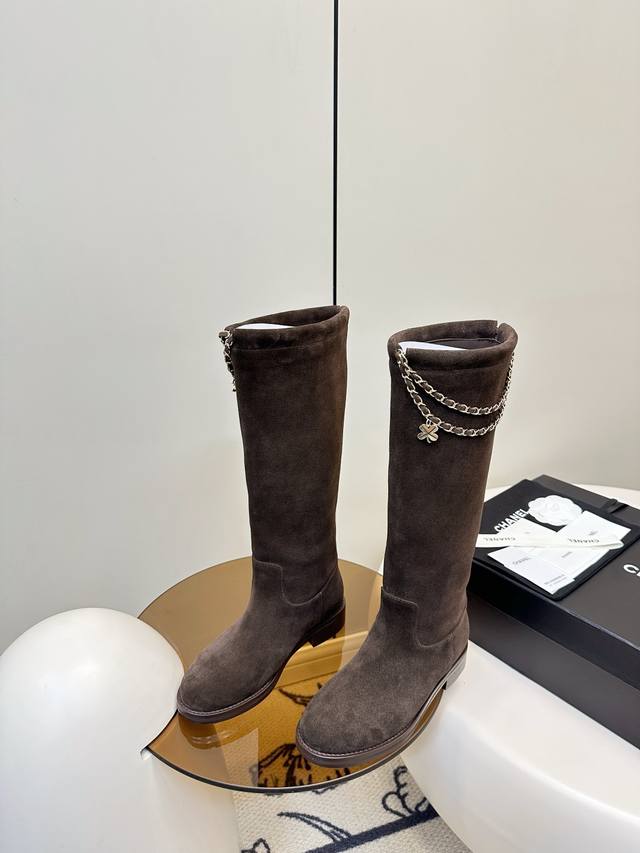 Chanel 25B四叶草 链条 麂皮 骑士靴 长靴 Chanel 25B链条麂皮短靴,四叶草金属链条装饰,经典双C标志超有辨识度。圆头粗跟设计,舒适又时髦,秋