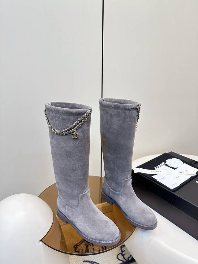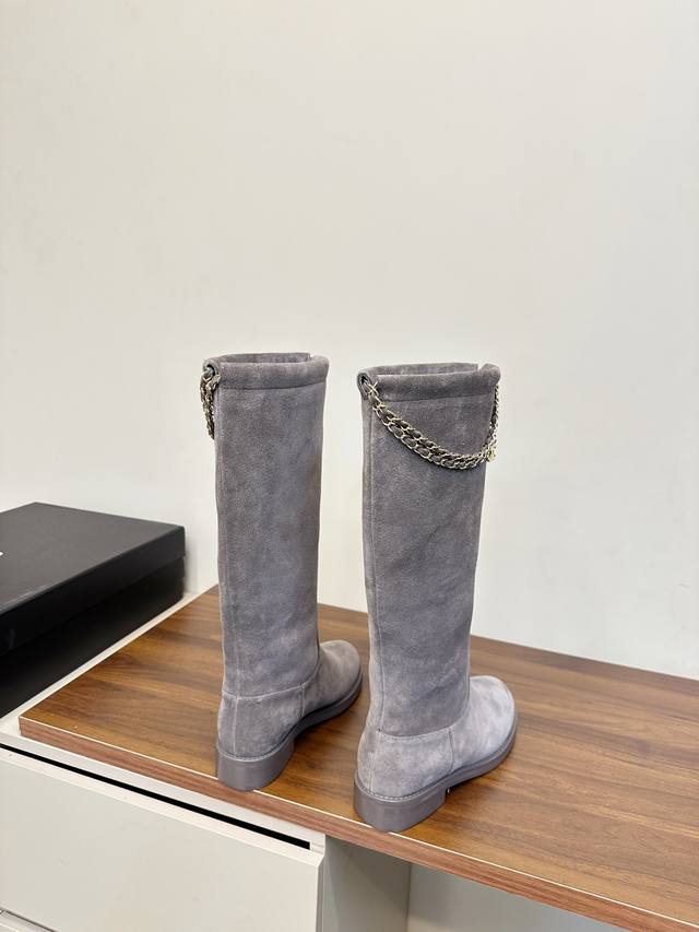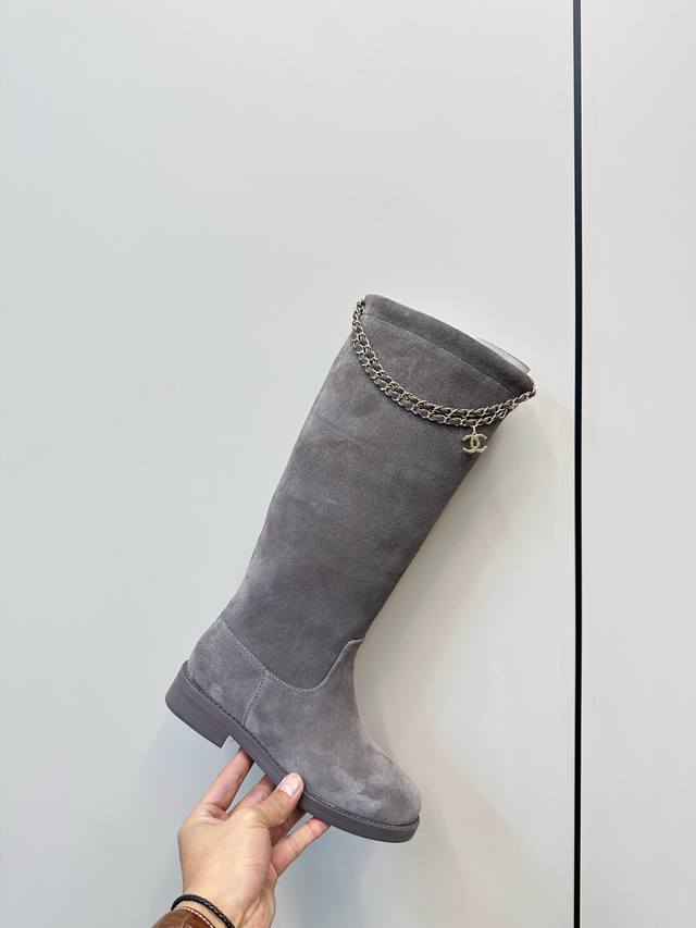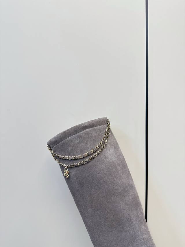 Chanel 25B四叶草 链条 麂皮 骑士靴 长靴 Chanel 25B链条麂皮短靴,四叶草金属链条装饰,经典双C标志超有辨识度。圆头粗跟设计,舒适又时髦,秋