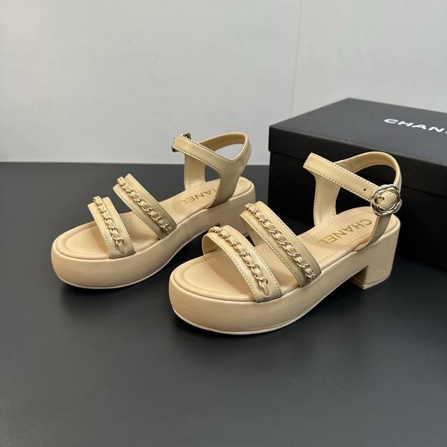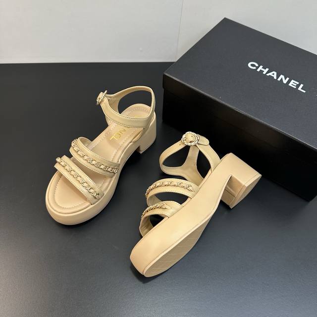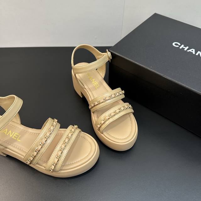 Chanel 25B 小香链条平底高跟厚底底台凉鞋 穿不腻的百搭凉鞋,超经典的一款 休闲中带着精致 气质拿捏稳妥 今年春夏绝美加分宝藏! 链条凉鞋今年的大爆款,已被它的美貌折服得随性自然 ,又有香家经典的霸道,从皮质到五金满满的高级感 ,上脚舒适又洋气! 鞋面:羊皮 内里垫脚:羊皮 高跟:平底 粗跟5Cm 鞋底:橡胶底 码数:35-39 40.41.42定做不退换