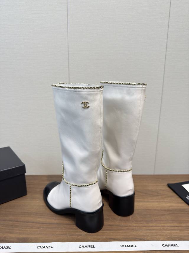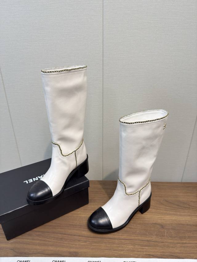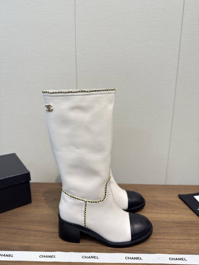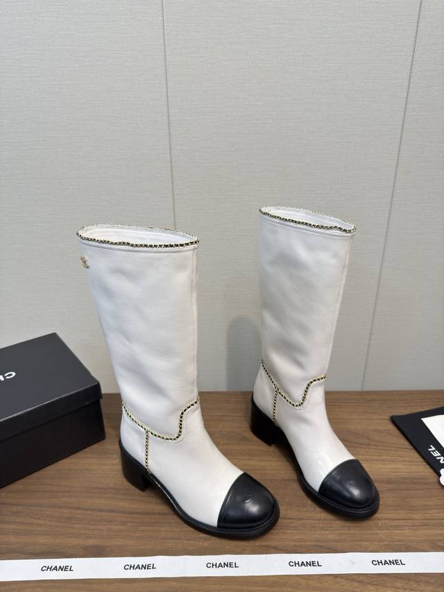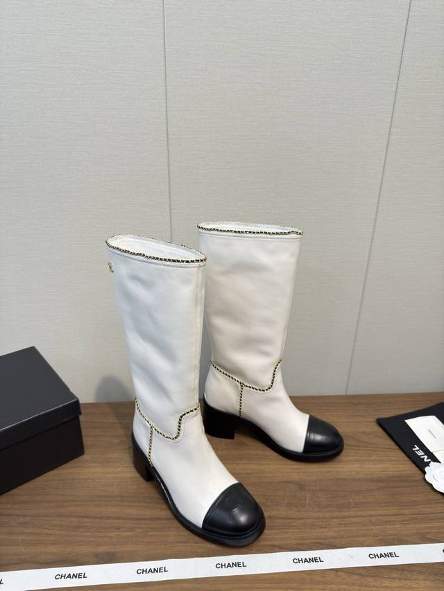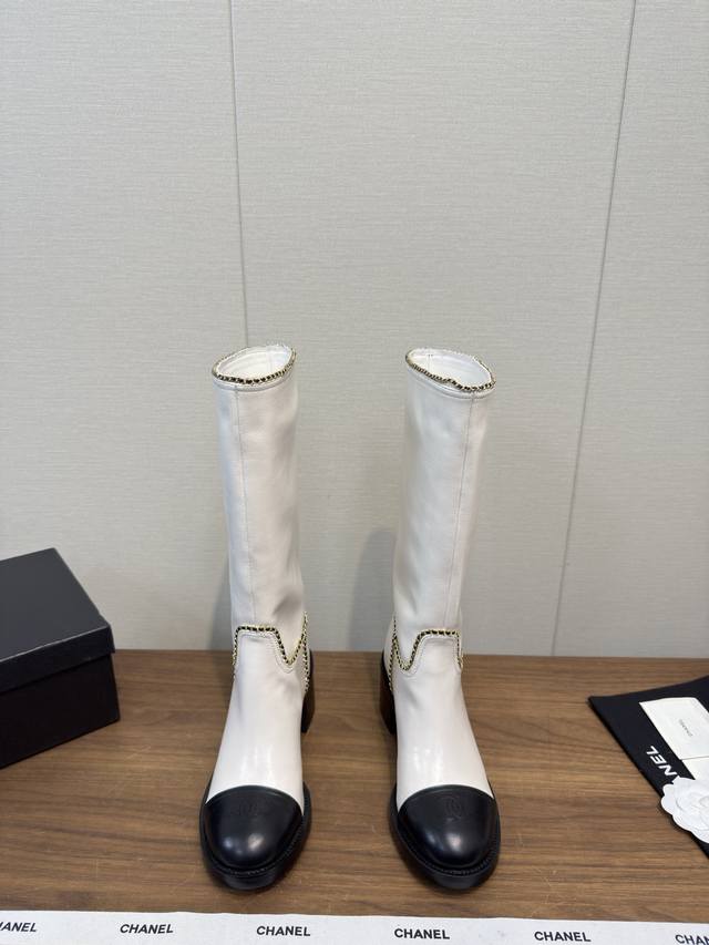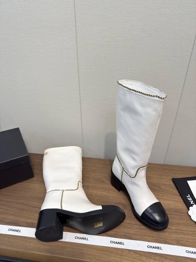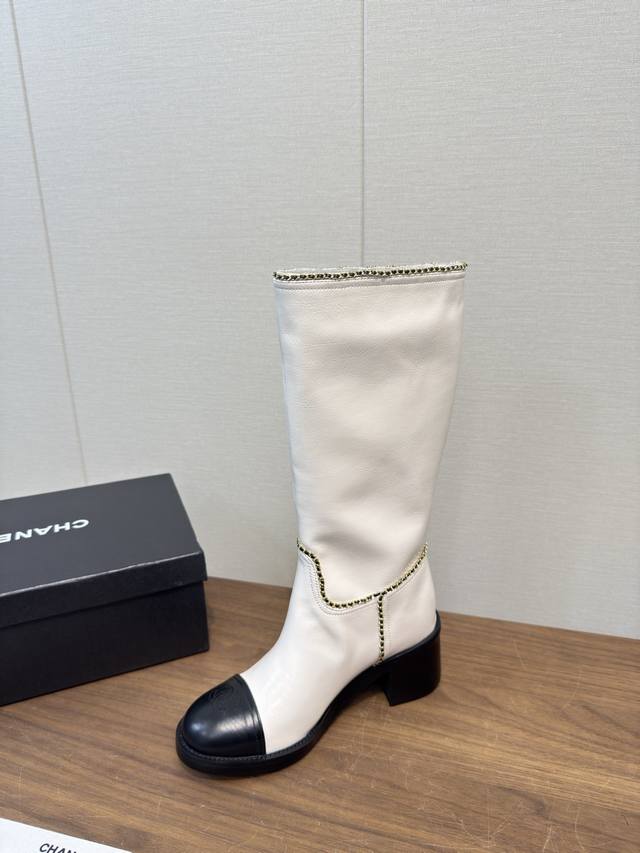 Chanel 25K 早秋秋冬靴复古风 链条切尔西长靴子 高版本 当香家长靴邂逅冬日 时尚与温暖共绽。漆皮的光泽如夜的深邃,绒面的柔和似午后暖阳,拼接设计巧妙勾勒精致轮廓。 经典元素融入每一处细节,中跟是优雅与舒适的完美平衡。 无论是漫步都市街头 还是赴一场优雅聚会,它都能让你在人群中熠熠生辉,成为时尚焦点 每一步都踏出独有的魅力! 鞋面:定制原版牛皮 内里垫脚:羊皮 鞋底:原版复刻真皮大底 跟高:7.5 码数:35-39 40.41定做不退换