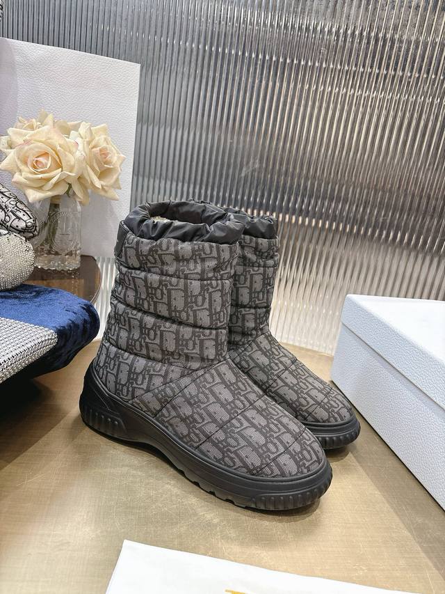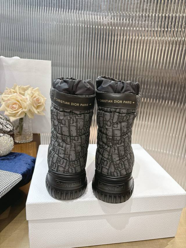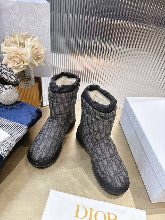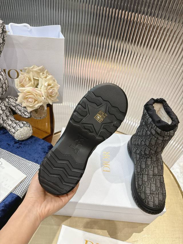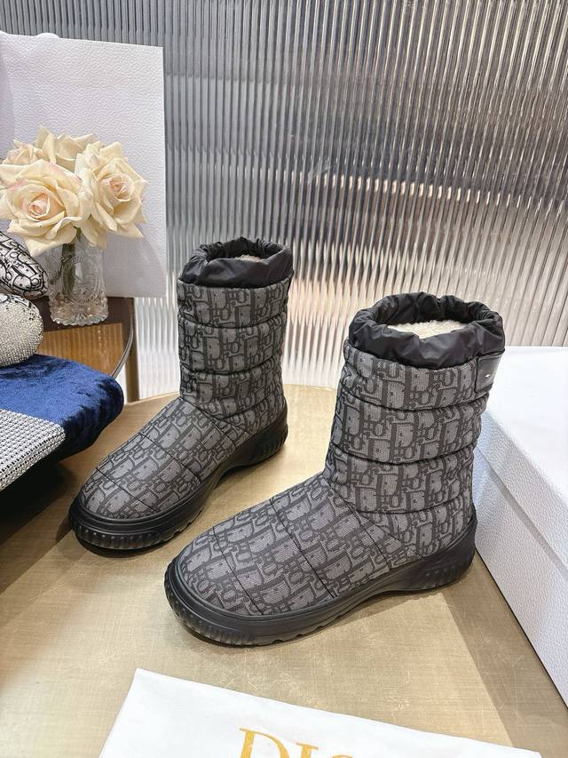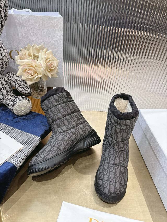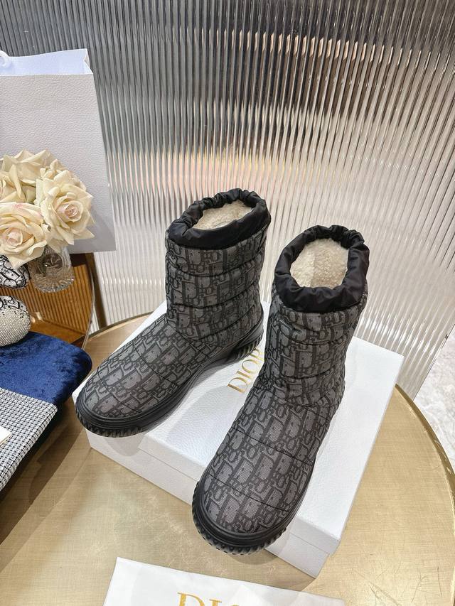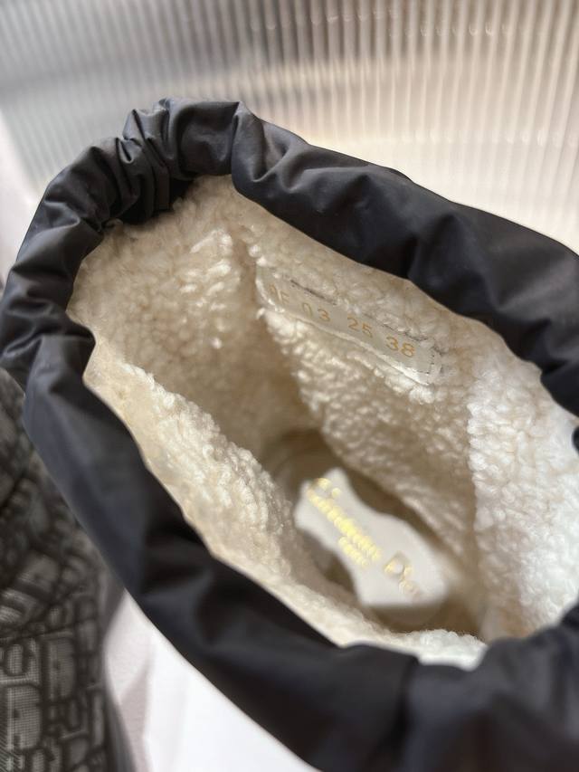 Di*Or 2025秋冬新款Frost 及踝靴 雪地靴 融入高订风格,全新演绎滑雪造型。黑色绗缝效果尼龙鞋面饰以藤格纹图案,搭配同色调皮毛一体里料,抽绳设计可调节理想的贴合度。靴筒后侧饰以金色“Christian Dior Paris”标志,Eva 厚底打造舒适非凡的穿着体验 大底:Eva发泡大底 鞋面:对版刺绣尼龙 内里:羊羔毛 码数:35-41 40 41定做