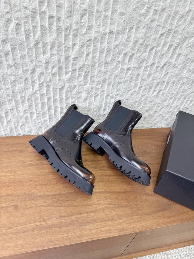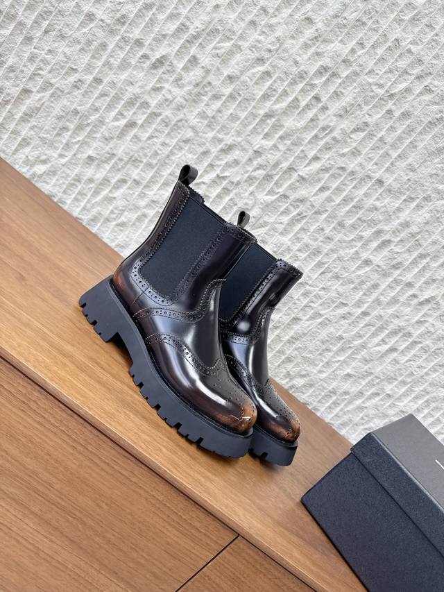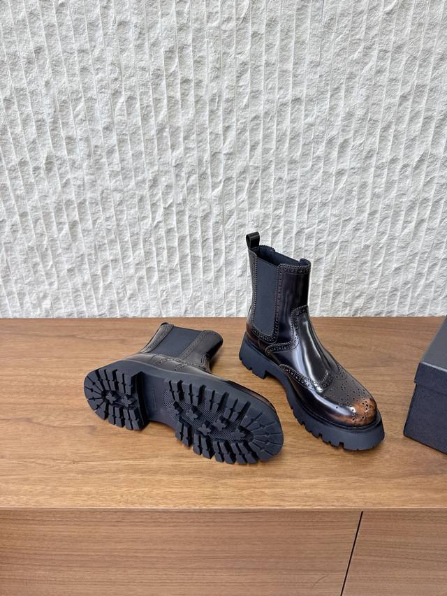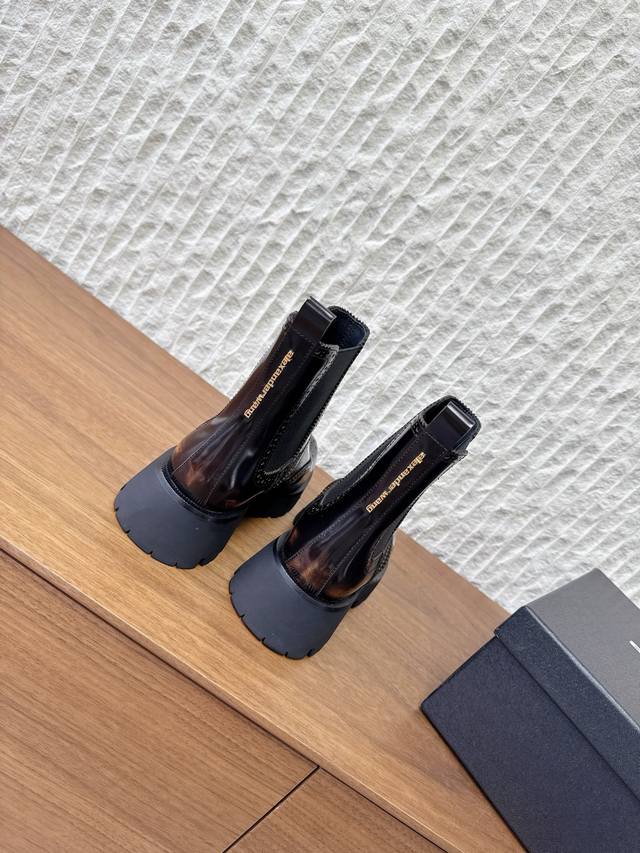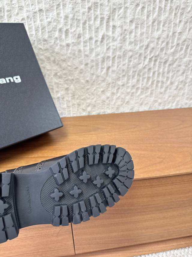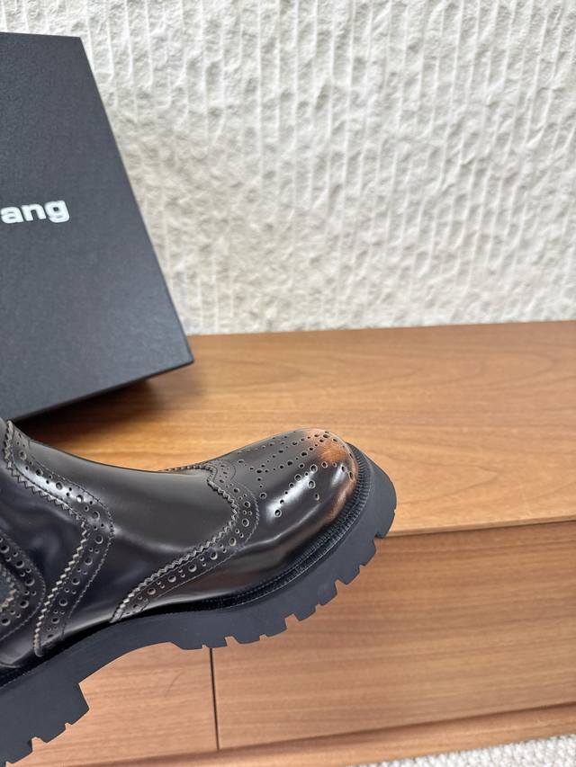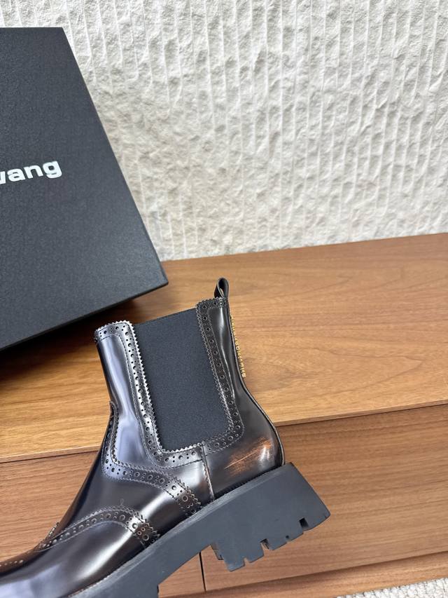 G172 Alexander Wang 大王 25Ss秋冬新款 布洛克 雕花 切尔西靴 短靴 将传统布洛克雕花与切尔西靴的松紧带靴筒结合,同时加入厚底工装风元素,既保留复古优雅感,又注入街头酷感。 延续Alexander Wang一贯的“酷飒极简”风格,在经典靴型基础上加入个性细节,彰显品牌独特的潮流态度。 鞋面采用亮面皮革,光泽度高,提升视觉高级感,同时易于清洁打理。厚实的橡胶大底不仅增强防滑性,还能有效增高,拉长腿部线条,优化身材比例。 鞋面:采用原版进口开边珠牛皮 内里垫脚:羊皮 大底:原版定制发泡