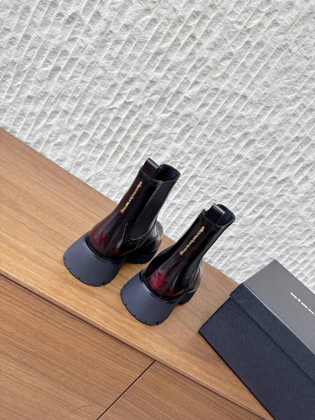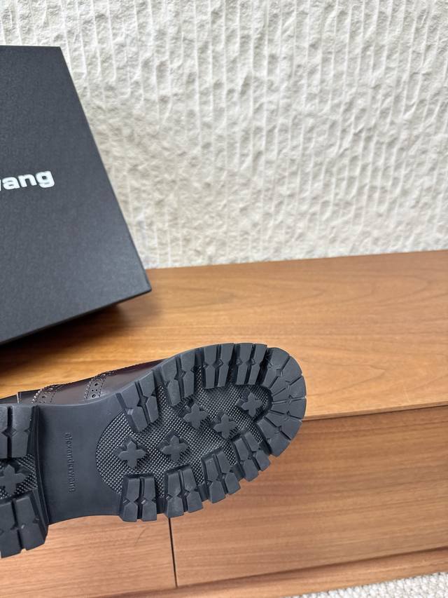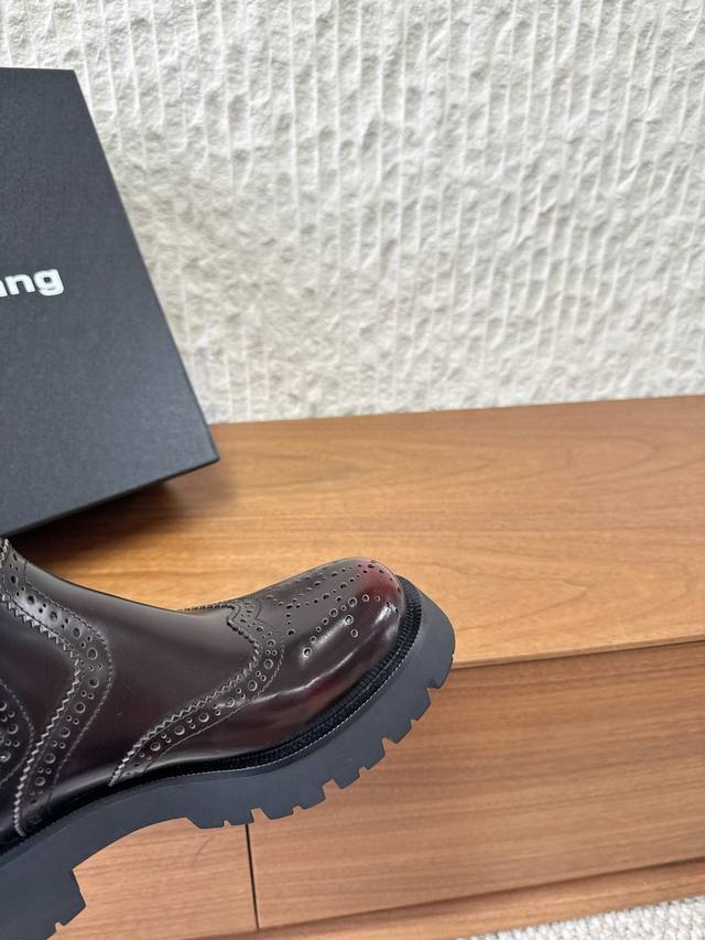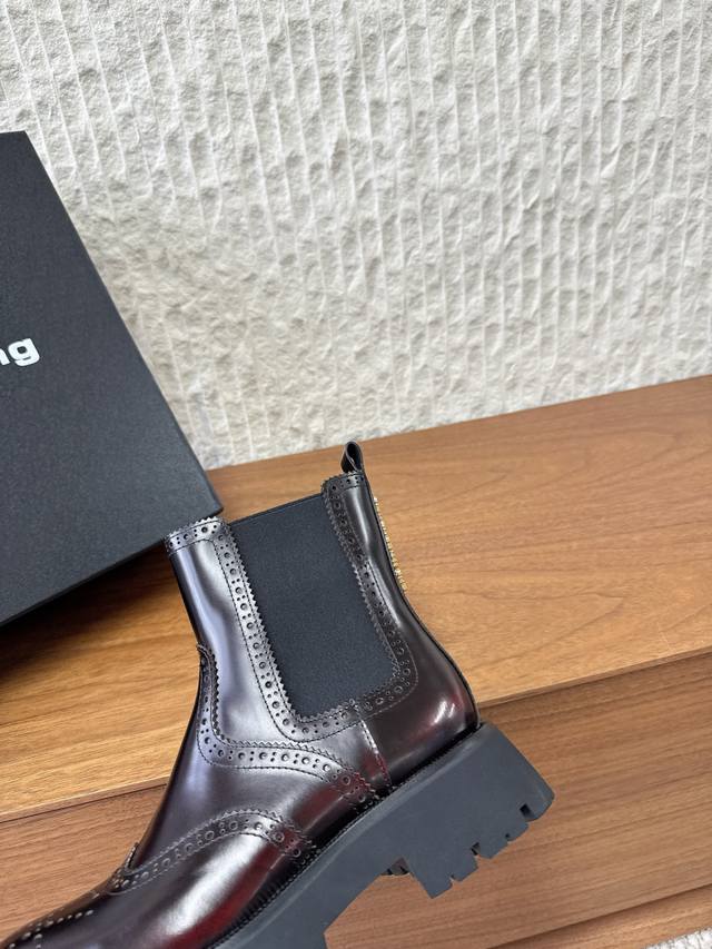 G172 Alexander Wang 大王 25Ss秋冬新款 布洛克 雕花 切尔西靴 短靴 将传统布洛克雕花与切尔西靴的松紧带靴筒结合,同时加入厚底工装风元素,既保留复古优雅感,又注入街头酷感。 延续Alexander Wang一贯的“酷飒极简”风格,在经典靴型基础上加入个性细节,彰显品牌独特的潮流态度。 鞋面采用亮面皮革,光泽度高,提升视觉高级感,同时易于清洁打理。厚实的橡胶大底不仅增强防滑性,还能有效增高,拉长腿部线条,优化身材比例。 鞋面:采用原版进口开边珠牛皮 内里垫脚:羊皮 大底:原版定制发泡