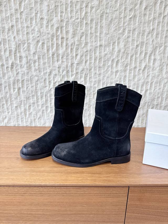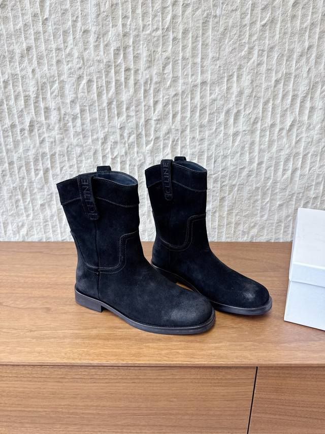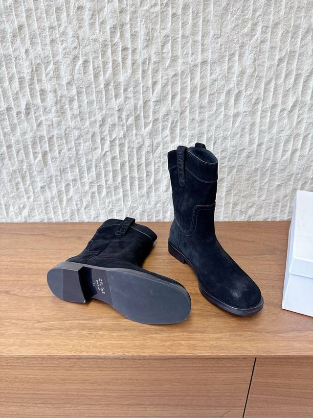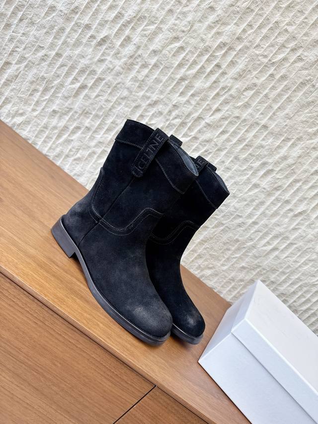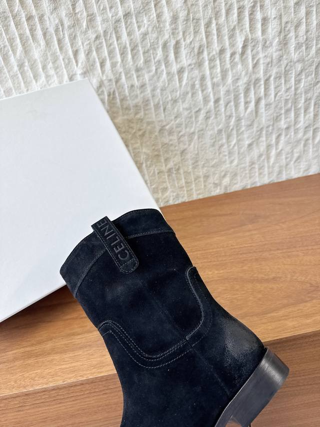 G299 Celine 赛琳 25Ss秋冬新品 复古粗跟 切尔西 西部靴 短靴 塞琳这一季好看的款式真的是很多 比如这款军靴就很机车风 重点夸夸靴筒设计 完全不挑腿型 上脚秒变大长腿,超级显瘦又百搭!简直绝绝子了 鞋面:采用原版进口麂皮 小牛皮 内里垫脚:羊皮 大底:原版定制意大利真皮大底 Size:35-39 40.41定做不退换