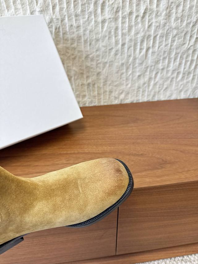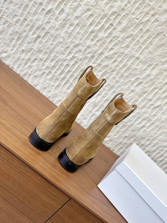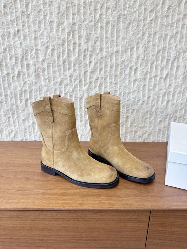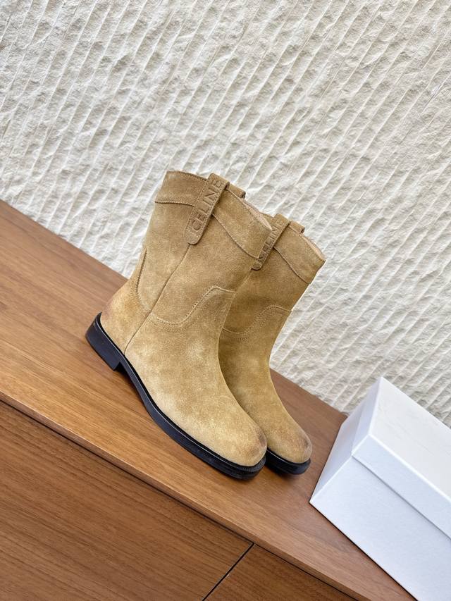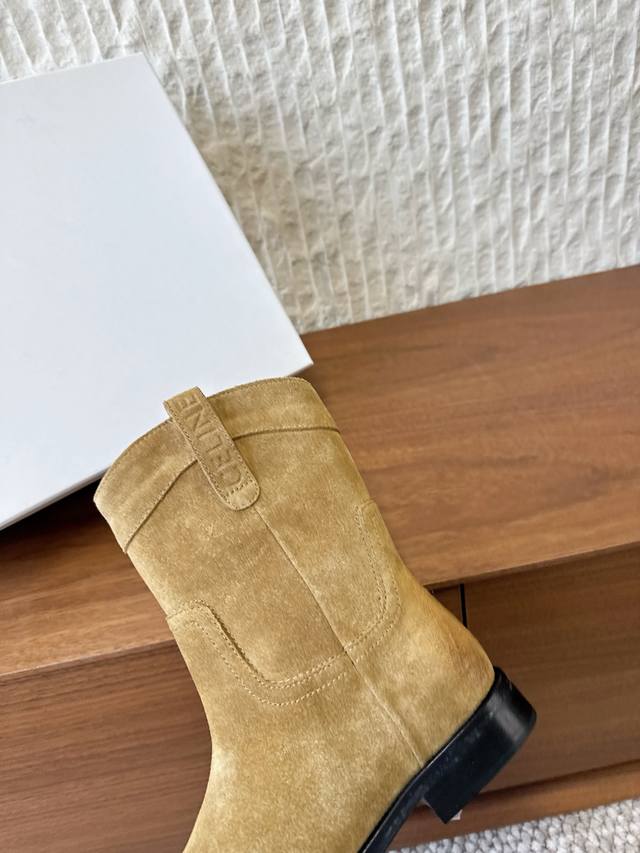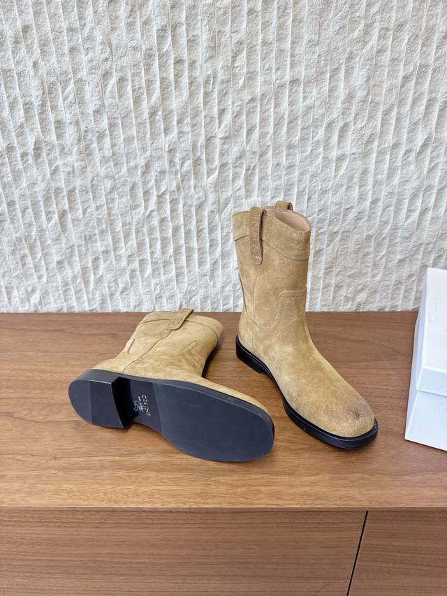 G299 Celine 赛琳 25Ss秋冬新品 复古粗跟 切尔西 西部靴 短靴 塞琳这一季好看的款式真的是很多 比如这款军靴就很机车风 重点夸夸靴筒设计 完全不挑腿型 上脚秒变大长腿,超级显瘦又百搭!简直绝绝子了 鞋面:采用原版进口麂皮 小牛皮 内里垫脚:羊皮 大底:原版定制意大利真皮大底 Size:35-39 40.41定做不退换