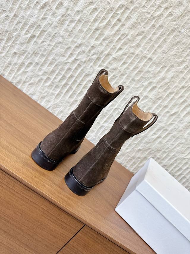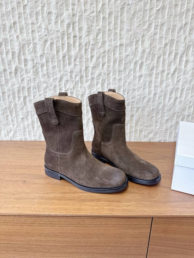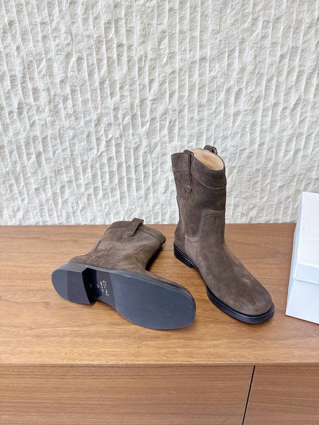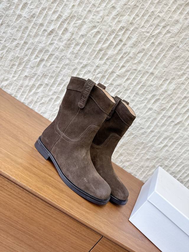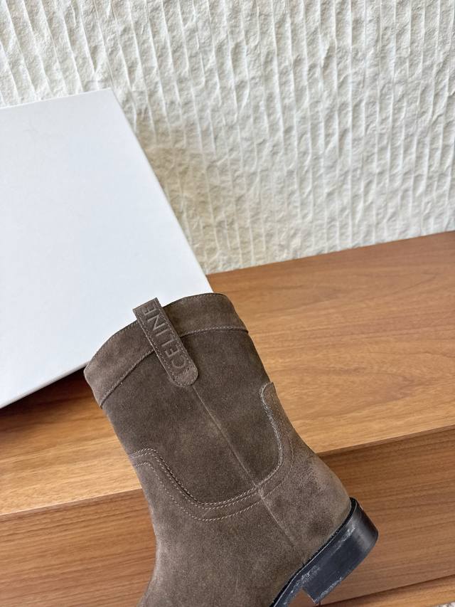 G299 Celine 赛琳 25Ss秋冬新品 复古粗跟 切尔西 西部靴 短靴 塞琳这一季好看的款式真的是很多 比如这款军靴就很机车风 重点夸夸靴筒设计 完全不挑腿型 上脚秒变大长腿,超级显瘦又百搭!简直绝绝子了 鞋面:采用原版进口麂皮 小牛皮 内里垫脚:羊皮 大底:原版定制意大利真皮大底 Size:35-39 40.41定做不退换
