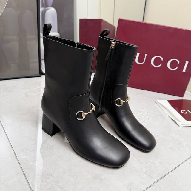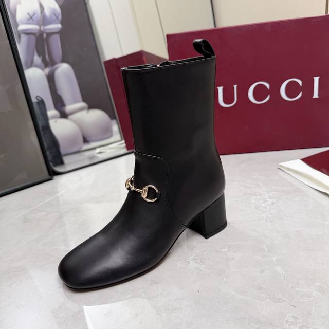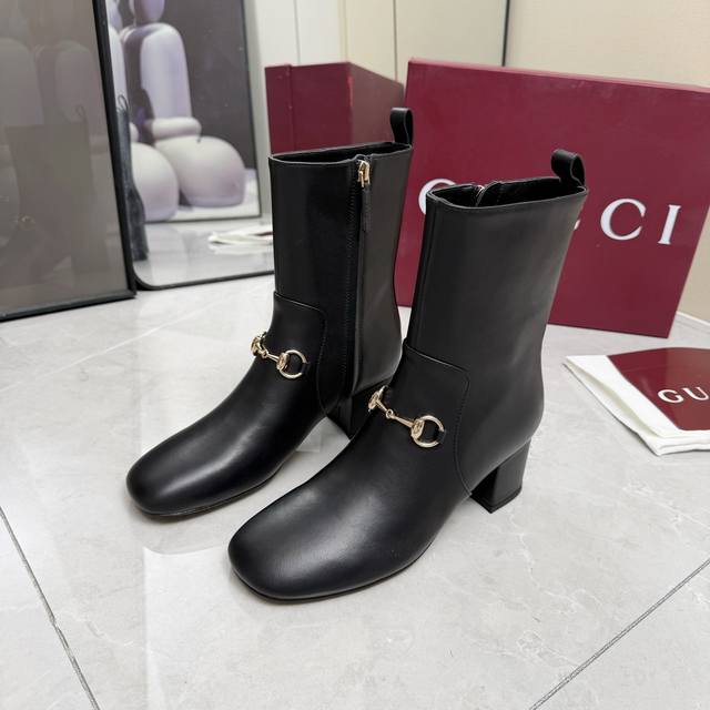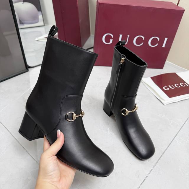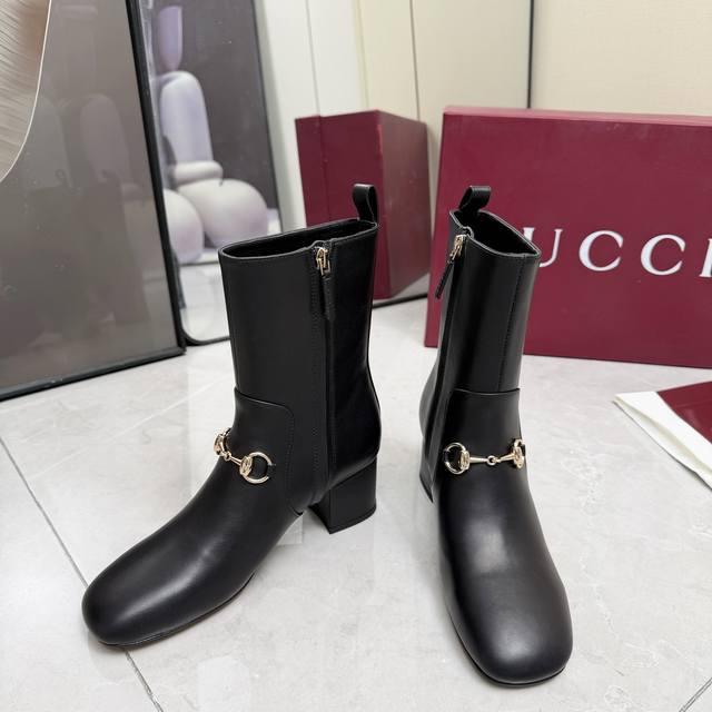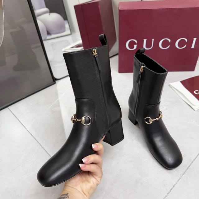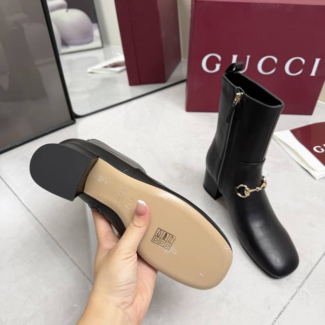 Gucci 古驰 秋冬款马衔扣短靴 经典的1955马衔扣 极简设计 没有一丝一毫的多余 半弧方形鞋头 饱满有型 整个鞋子的线条感是非常柔和的 弧度贴合脚型 侧拉链设计 方便穿脱 值得拥有 面料:进口小牛皮 内里:羊皮 大底:意大利真皮大底 跟高:5.5Cm 码数:35-40 41 42订制