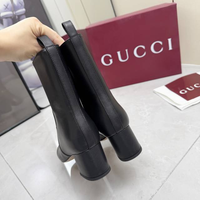 / Gucci 古驰 秋冬款马衔扣短靴 经典的1955马衔扣 极简设计 没有一丝一毫的多余 半弧方形鞋头 饱满有型 整个鞋子的线条感是非常柔和的 弧度贴合脚型 侧拉