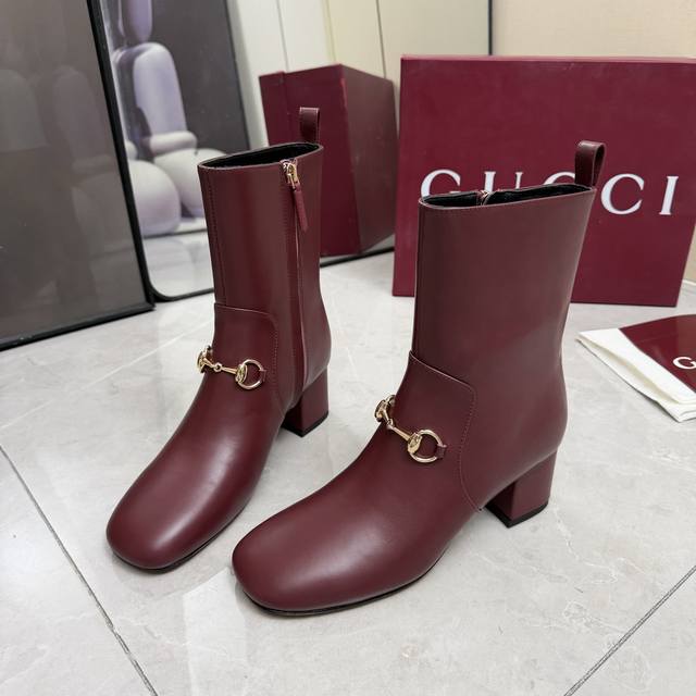 Gucci 古驰 秋冬款马衔扣短靴 经典的1955马衔扣 极简设计 没有一丝一毫的多余 半弧方形鞋头 饱满有型 整个鞋子的线条感是非常柔和的 弧度贴合脚型 侧拉