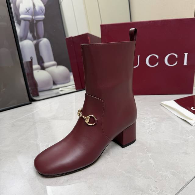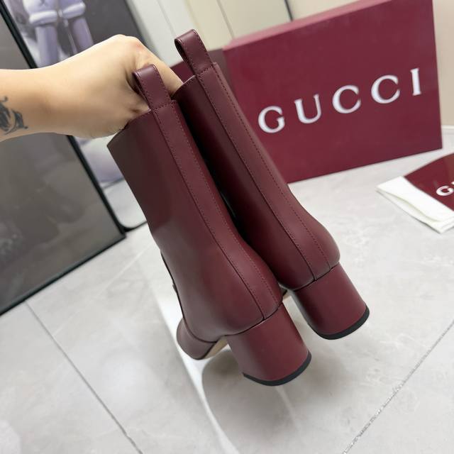 / Gucci 古驰 秋冬款马衔扣短靴 经典的1955马衔扣 极简设计 没有一丝一毫的多余 半弧方形鞋头 饱满有型 整个鞋子的线条感是非常柔和的 弧度贴合脚型 侧拉