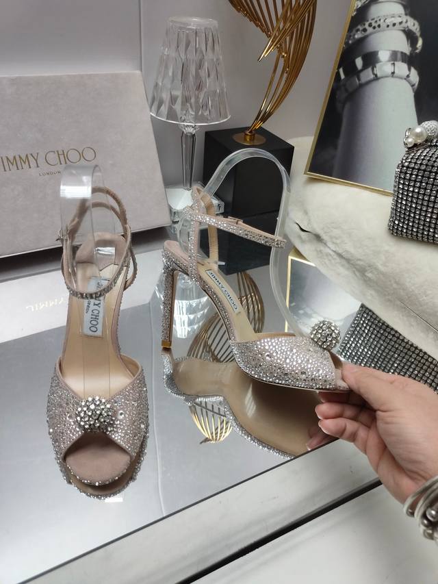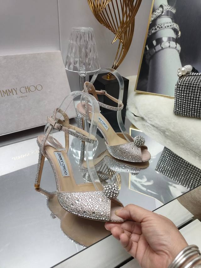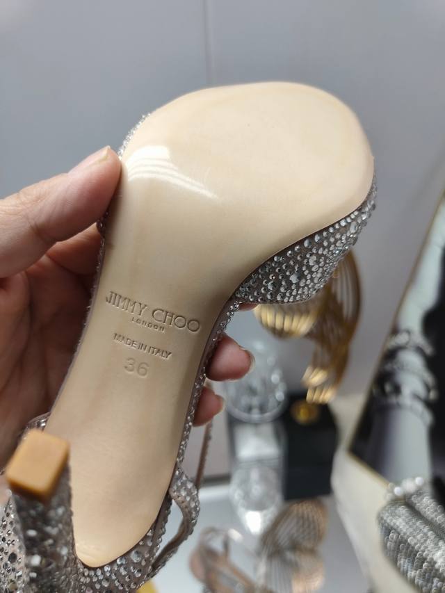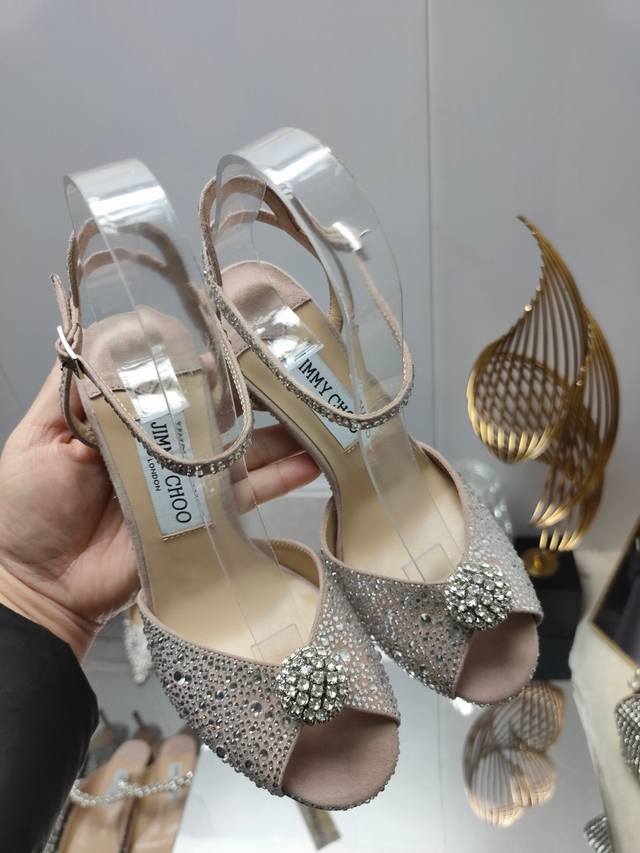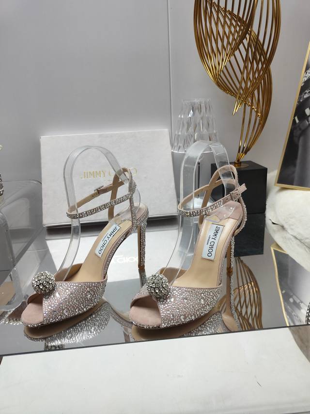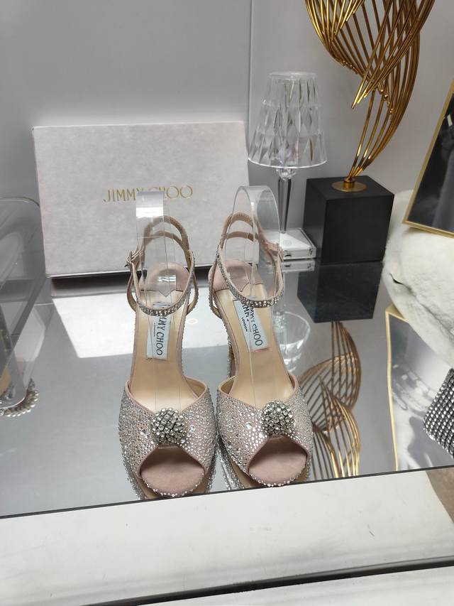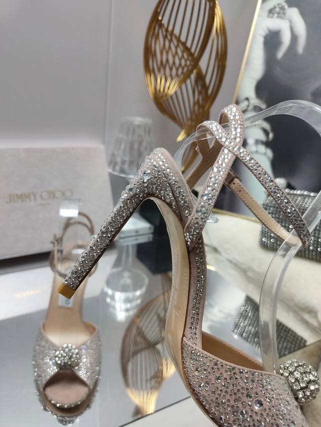 Jimmy Choo 一款复古风凉鞋,采用裸粉色闪光绒面革手工制作,饰有层叠水晶。这款新娘鞋饰有精美的踝带点缀优雅的V形露趾 鞋面:羊京 奥钻 内里:羊皮 跟高:8.5Cm 10Cm 码数:35-39 34 40 41 42定做不退换