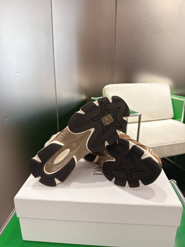 K020 Dior 迪奥Dior Vibe 运动鞋 这款 Dior Vibe 运动鞋融入 Dior 的高订精神,重新诠释经典跑鞋。白色网眼织物饰以 Oblique 印花图案,搭配金色和银色调层压皮革效果镶片,打造对比鲜明的时尚造型。以 3D 效果细节、后侧幸运星符号、鞋舌和后侧提拉环上的标志等经典细节进一步点缀。轻盈的鞋底饰以灰色星星,与各式休闲或优雅单品相得益彰,打造摩登造型。 码数:35-41 42可定做