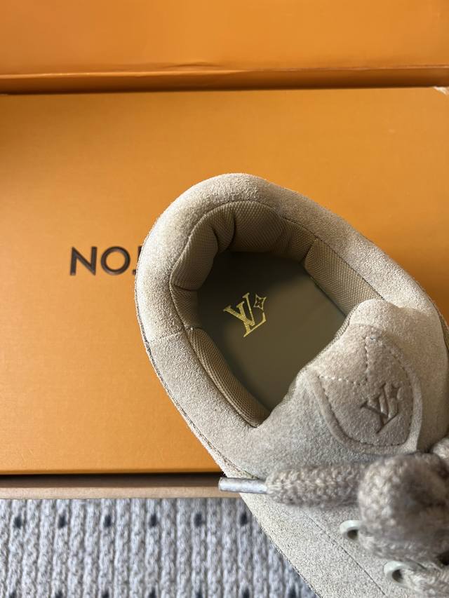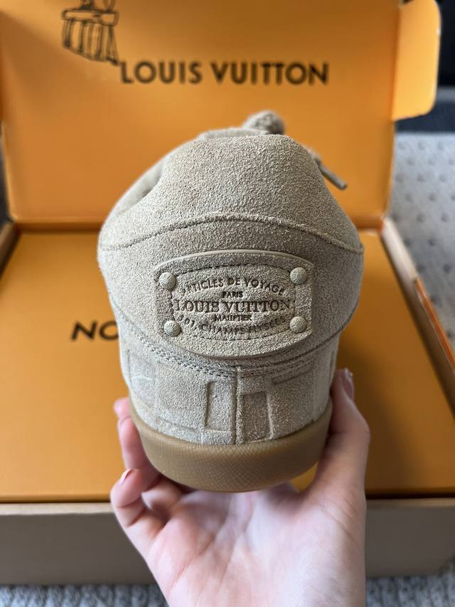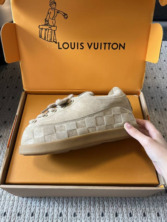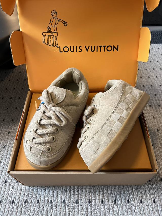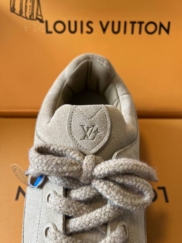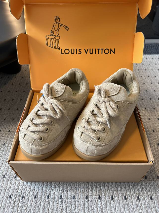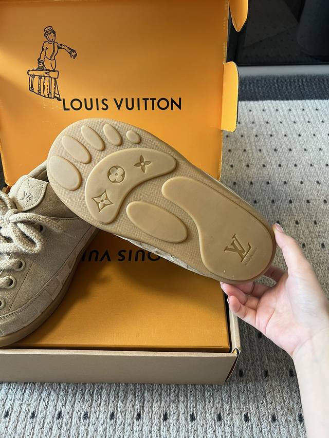 Louis Vuitto* 路易威登系带 厚底胖丁鞋 最新款情侣 男女款 德比鞋 外观上,它采用浅米色的麂皮材质,质感细腻。鞋面上有品牌标志性的“Lv”压印,搭配粗麻绳质感的鞋带,系成蝴蝶结样式,增添了几分随性与精致感。鞋底为浅棕色,与鞋身颜色相呼应,整体风格简约又不失品牌辨识度。 日常逛街时,搭配休闲装,既舒适又有时尚感,能轻松应对长时间行走;和朋友约咖啡,简约又有质感的它,能为整体造型加分,尽显优雅随性;周末短途出游,无论是漫步城市街头,还是去郊外小逛,都能适配轻松的氛围,让穿搭既舒适又不失格调。 鞋