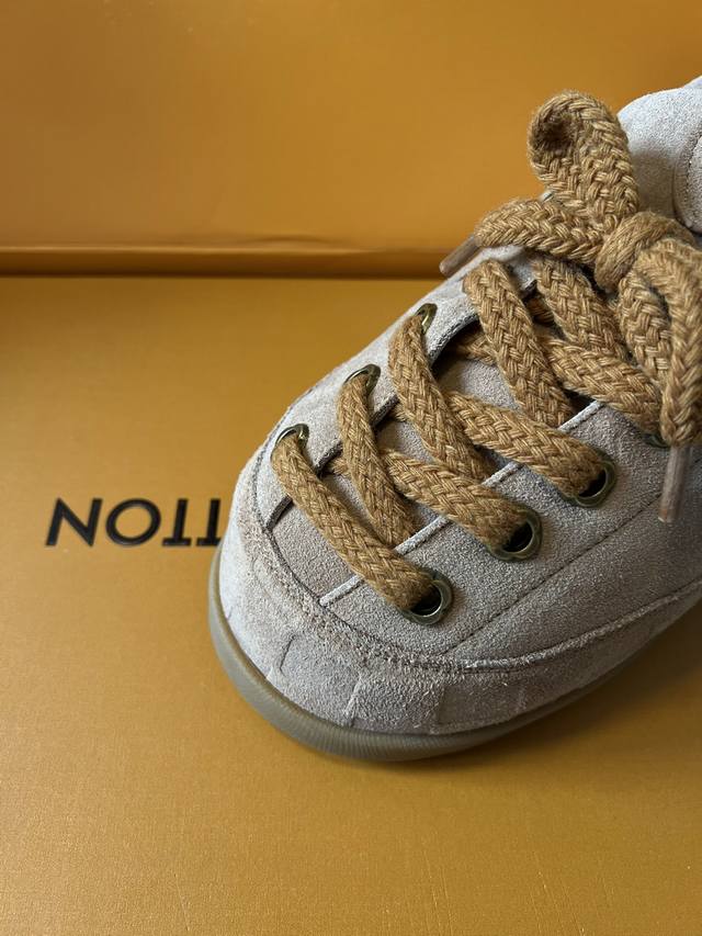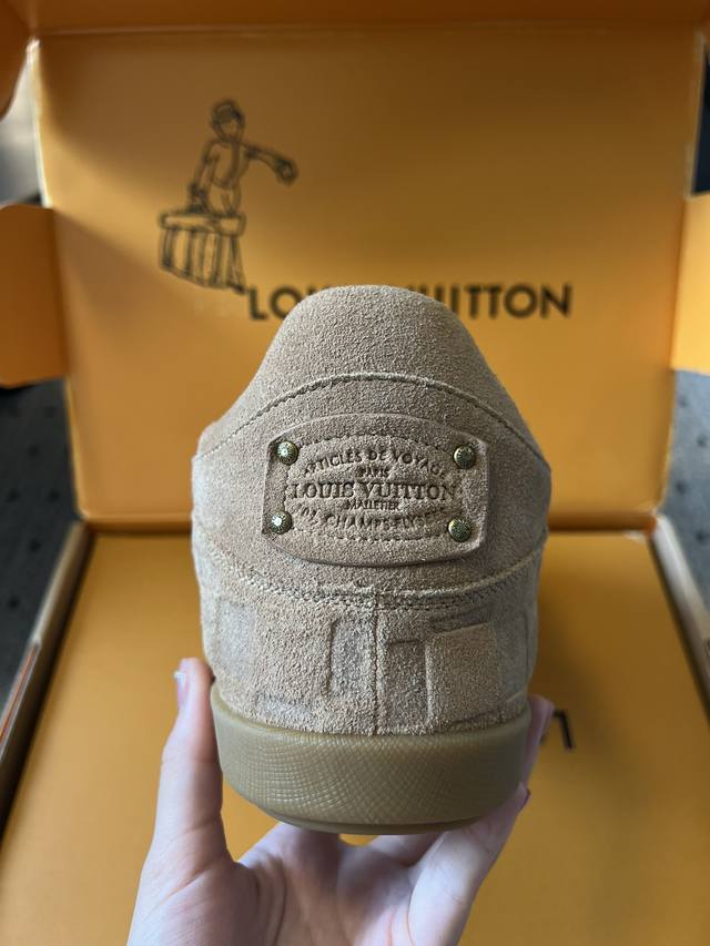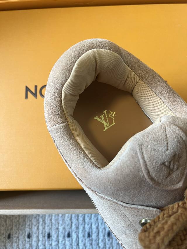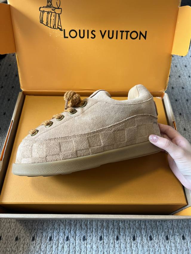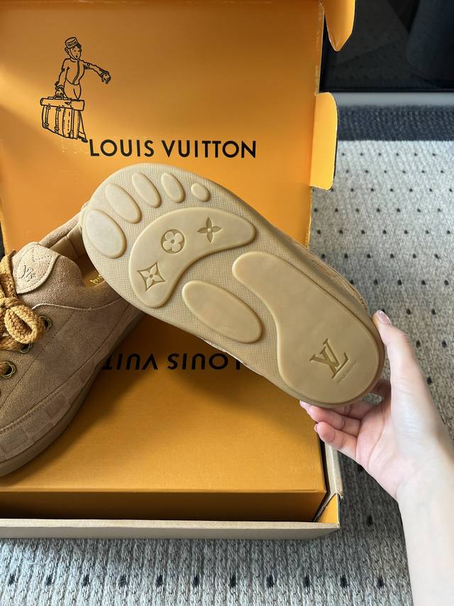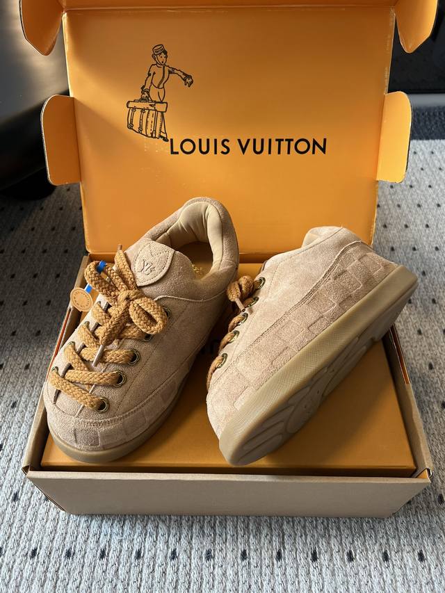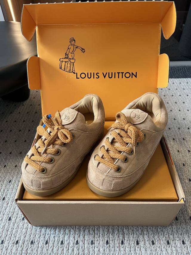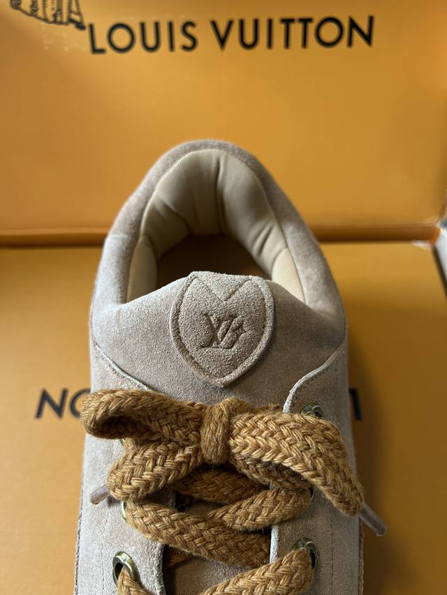 Louis Vuitto* 路易威登系带 厚底胖丁鞋 最新款情侣 男女款 德比鞋 外观上,它采用浅米色的麂皮材质,质感细腻。鞋面上有品牌标志性的“Lv”压印,搭配粗麻绳质感的鞋带,系成蝴蝶结样式,增添了几分随性与精致感。鞋底为浅棕色,与鞋身颜色相呼应,整体风格简约又不失品牌辨识度。 日常逛街时,搭配休闲装,既舒适又有时尚感,能轻松应对长时间行走;和朋友约咖啡,简约又有质感的它,能为整体造型加分,尽显优雅随性;周末短途出游,无论是漫步城市街头,还是去郊外小逛,都能适配轻松的氛围,让穿搭既舒适又不失格调。 鞋