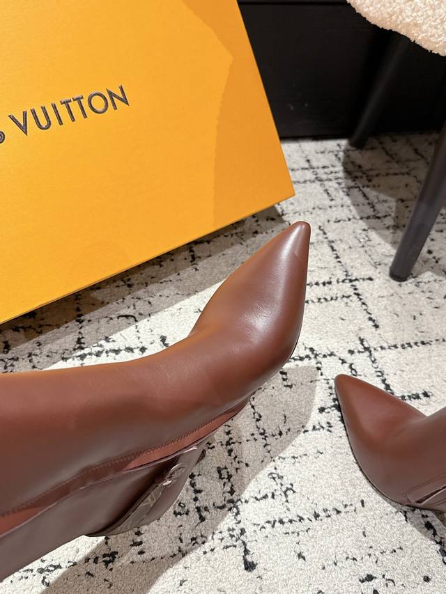 Louis Vuitton 早秋新款 25 Lv Legacy 尖头高跟长靴侧拉链老花皮带长筒靴 本款 Legacy 及踝靴取材光滑牛皮革,搭配宛若品牌传统硬箱