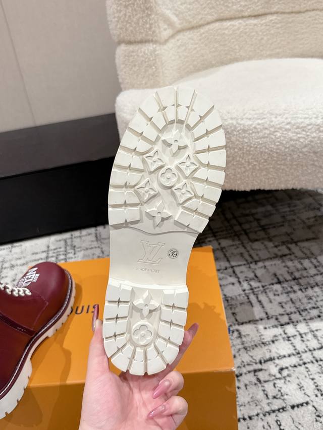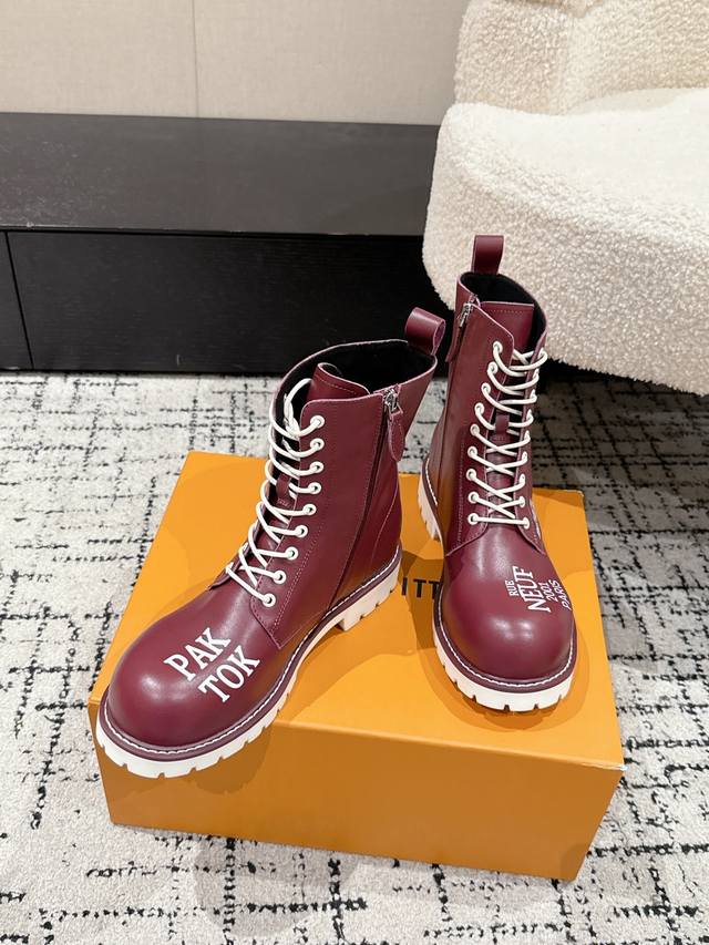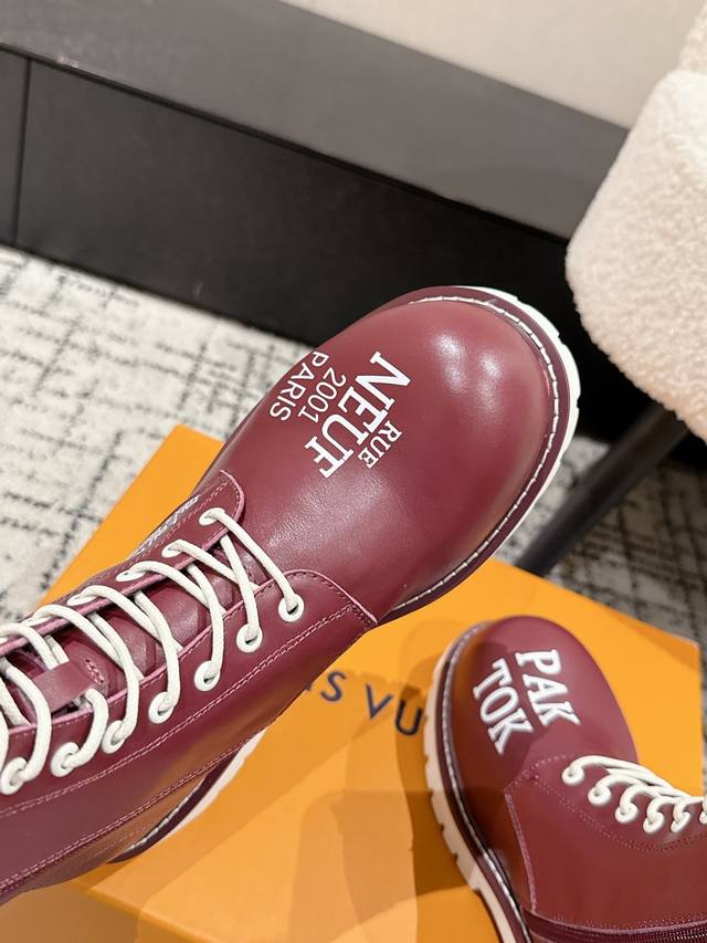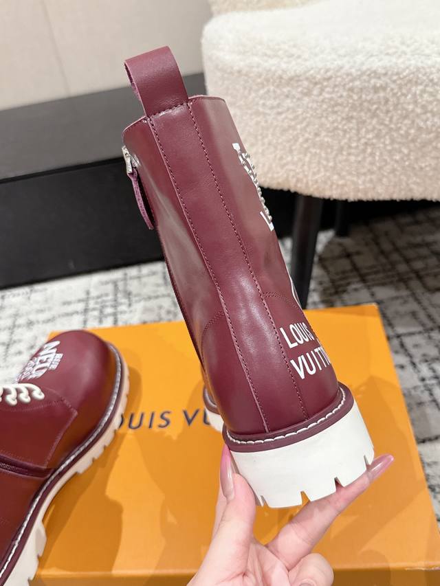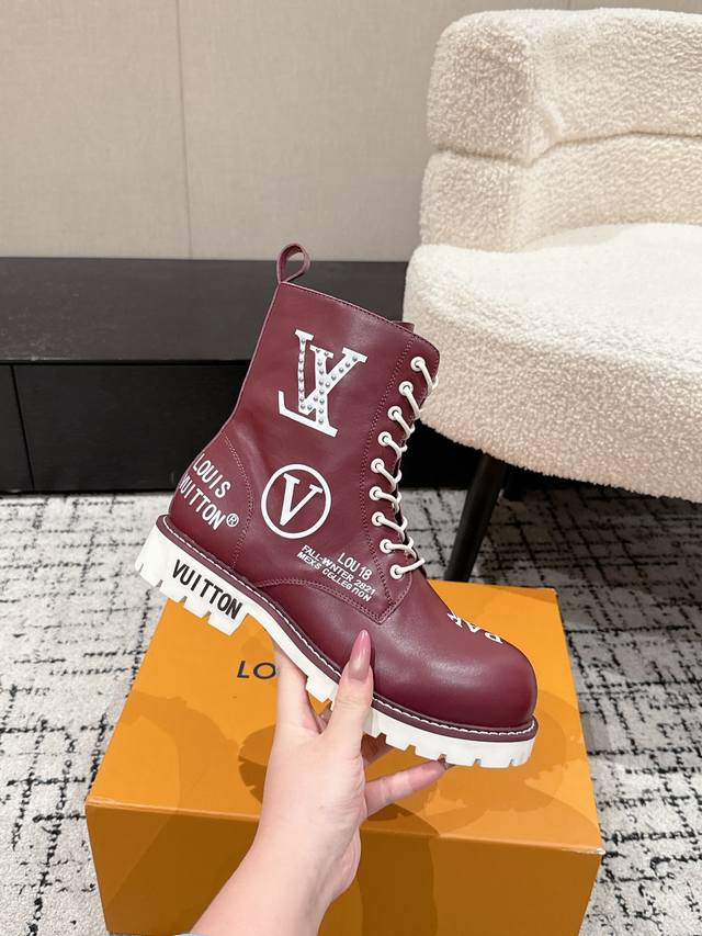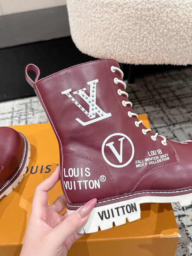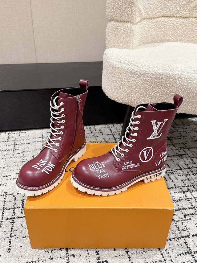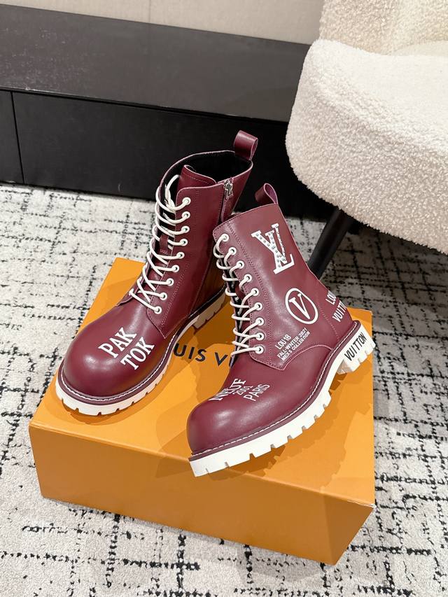/ Louis Vuitton 秋冬新款 25 Lv 涂鸦马丁靴系列情侣装侧拉链短靴系带厚底马丁靴 本款涂鸦铆钉马丁靴承载军旅灵感和路易威登的旅行传承,为舒软牛皮革