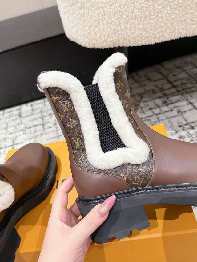 Louis Vuitton 秋冬新款 25 Lv Beaubourg 羊毛口切尔西及踝靴松紧带棋盘格老花皮拼色厚底高跟切尔西短靴 本款 Lv Beaubourg羊毛口切尔西及踝靴拼接光滑牛皮革和Monogram帆布,以率性风姿回归潮流视野。凸纹微型外底厚实而不失轻盈质感,环绕沿条的撞色缝线为经典设计注入考究气息。 面料:牛皮 老花皮 内里:羊皮 大底:开模组合橡胶大底 Size:#35-41 40.41定做不退换