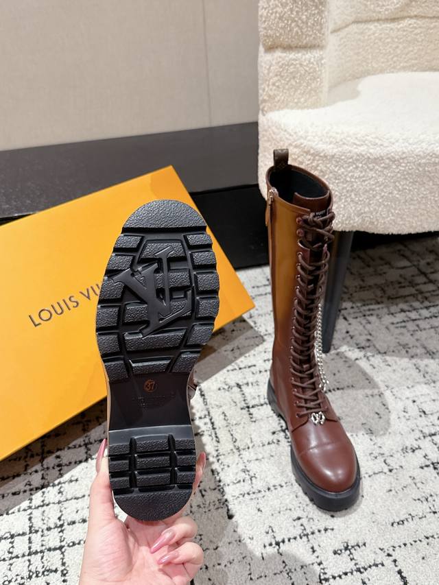 Louis Vuitton 秋冬新款 25 Lv District Ranger 长靴 链条老花吊坠骑士靴系带厚底侧拉链长筒靴 本款District Ranger长筒靴承载军旅灵感和路易威登的旅行传承,为舒软牛皮革鞋面点缀金属链条和Monogram帆布制成的行李牌形状挂饰。Eva 外底拥有细致凸纹,厚实而不失轻盈。 面料:牛皮 老花皮 内里:羊皮 大底:开模组合橡胶大底 Size:#35-41 40.41定做不退换