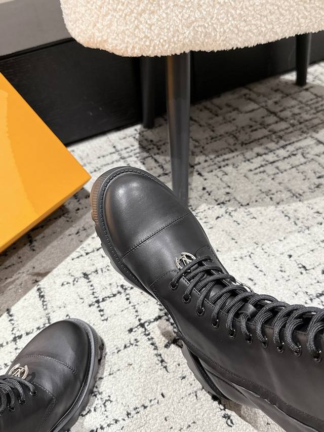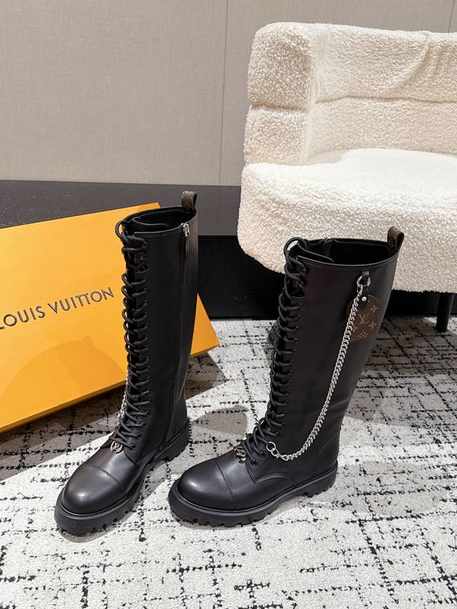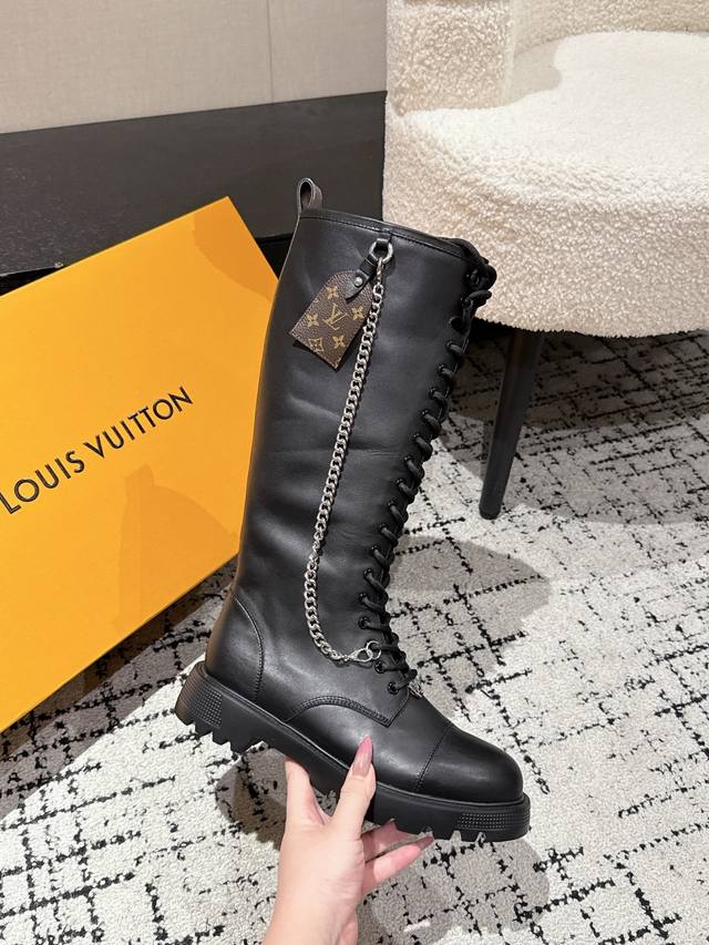 Louis Vuitton 秋冬新款 25 Lv District Ranger 长靴 链条老花吊坠骑士靴系带厚底侧拉链长筒靴 本款District Ranger长筒靴承载军旅灵感和路易威登的旅行传承,为舒软牛皮革鞋面点缀金属链条和Monogram帆布制成的行李牌形状挂饰。Eva 外底拥有细致凸纹,厚实而不失轻盈。 面料:牛皮 老花皮 内里:羊皮 大底:开模组合橡胶大底 Size:#35-41 40.41定做不退换