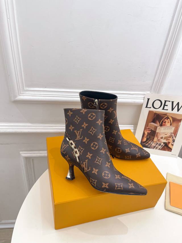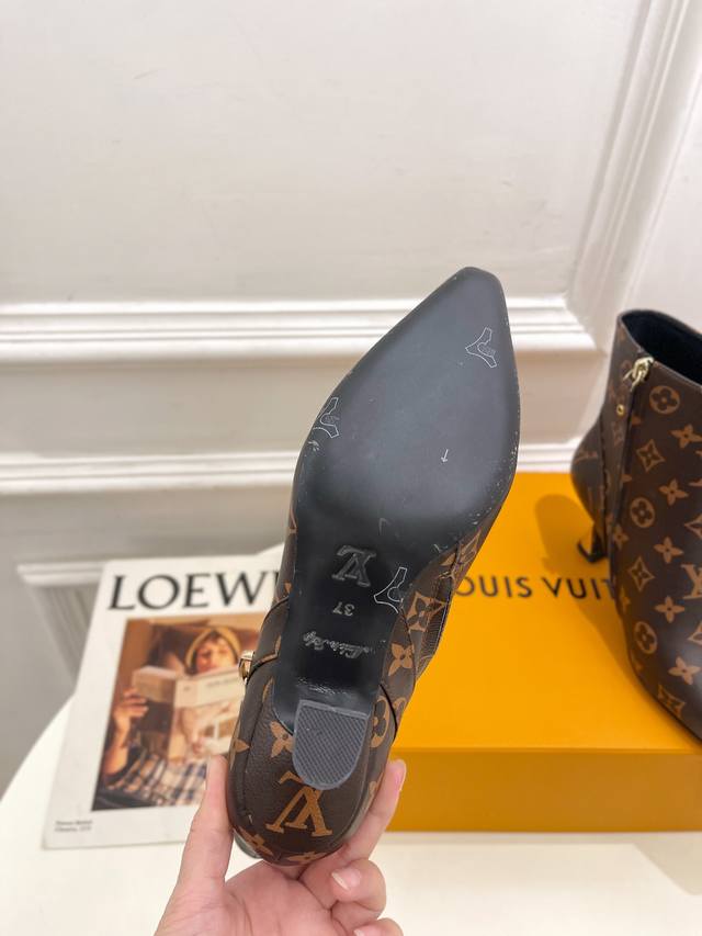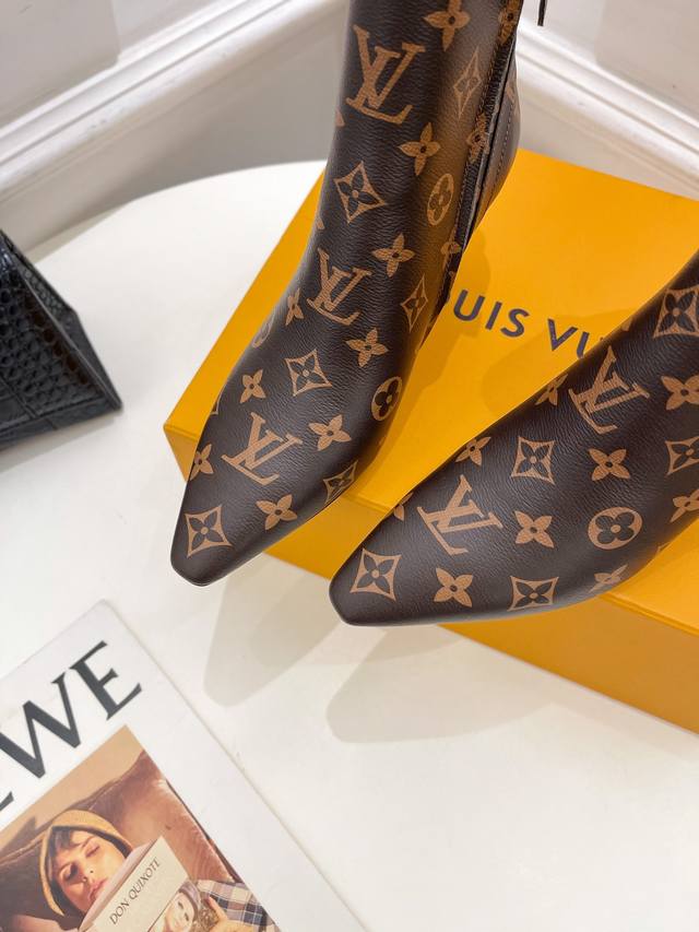 Lv 路易威登 25 2025 秋冬新款 顶级版本 专柜主打最新款 小方头金属跟裸靴 硬货上新 代购级别!高级感十足!国内外博主刷爆的一款,复古又时髦 上脚美炸了!官网主推款★ T 鞋面:原版小牛皮 老花皮 牛仔布 内里:进口山羊皮里 大底:原版意大利真皮大底 跟高:6.5Cm、9.5Cm 鞋码: 35-39 34、40、41定制不退换 出厂价Pp:中跟牛仔布: 中跟 皮面: