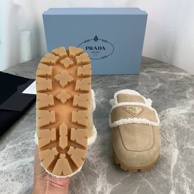 P家最新款毛拖 面:进口高丝光牛反绒 里:进口羊羔毛 垫:羊羔毛 底:原版开模防滑花纹大底 标志性三角标,原版包装 Size :35-41 40、41定制