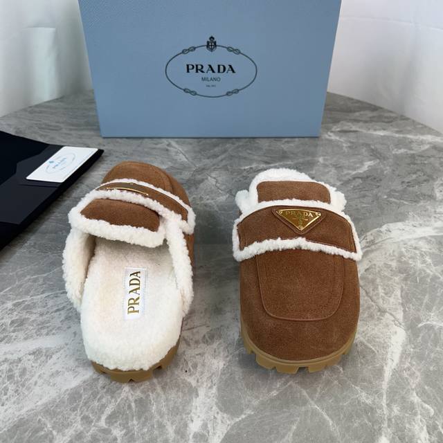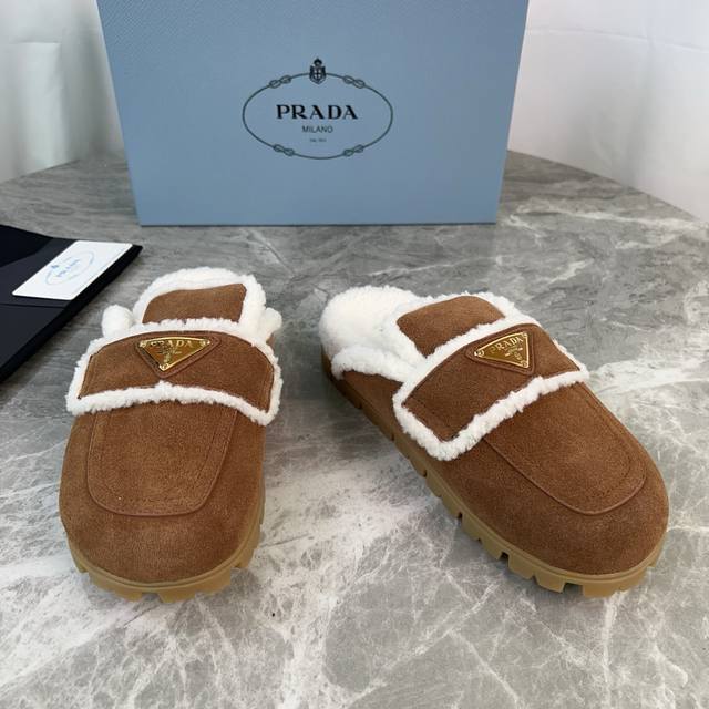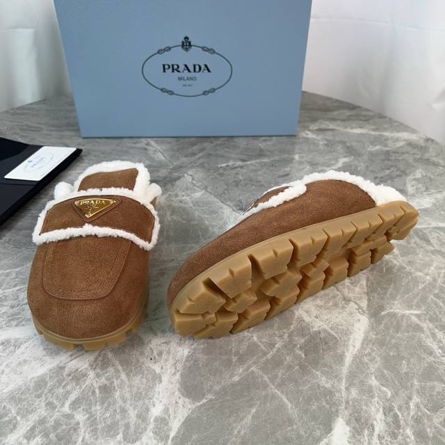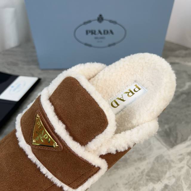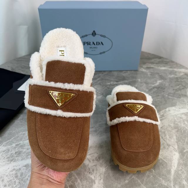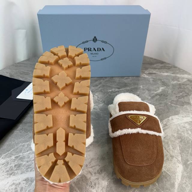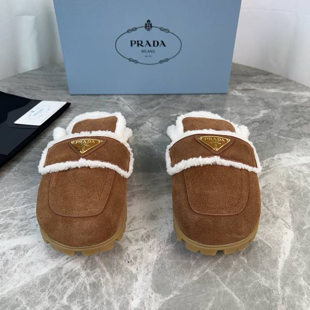 P家最新款毛拖 面:进口高丝光牛反绒 里:进口羊羔毛 垫:羊羔毛 底:原版开模防滑花纹大底 标志性三角标,原版包装 Size :35-41 40、41定制