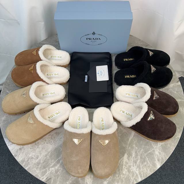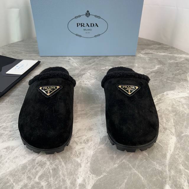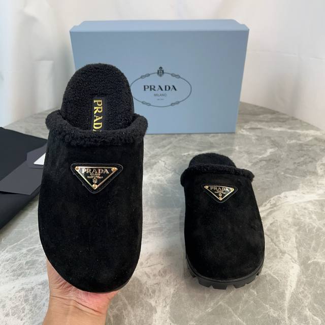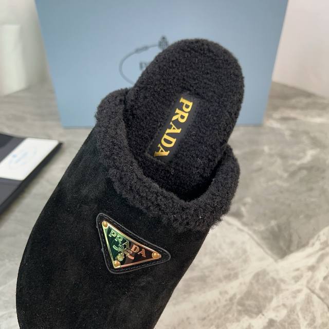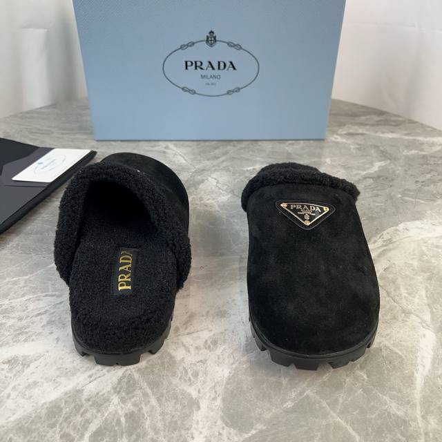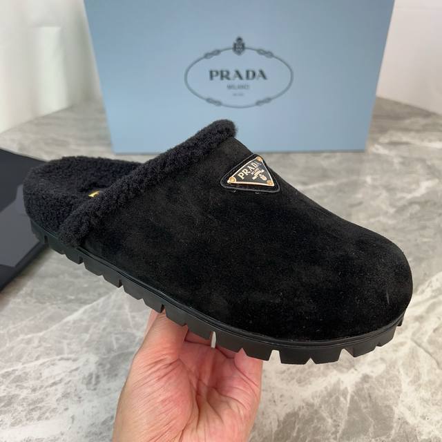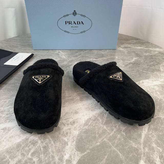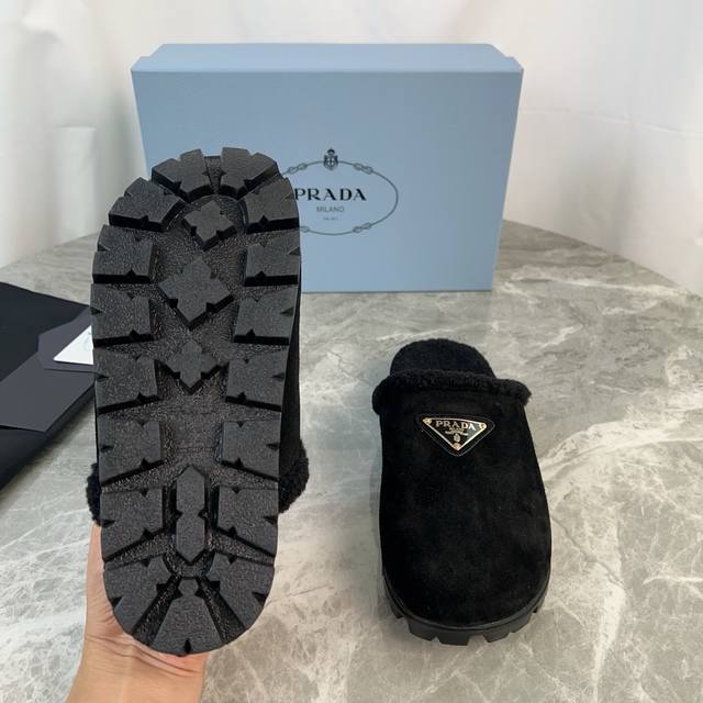 P家最新款毛拖 面:进口高丝光牛反绒 里:进口羊羔毛 垫:羊羔毛 底:原版开模防滑花纹大底 标志性三角标,原版包装 Size :35-41 40、41定制