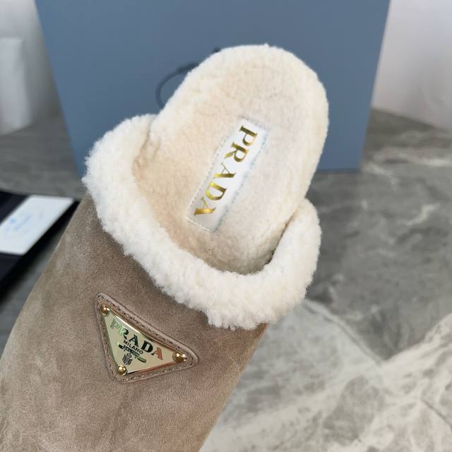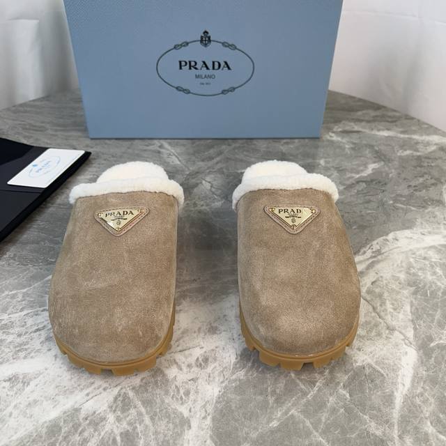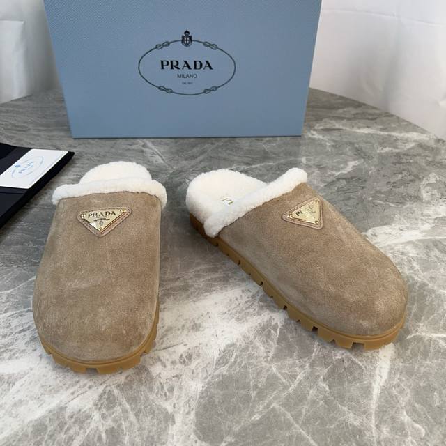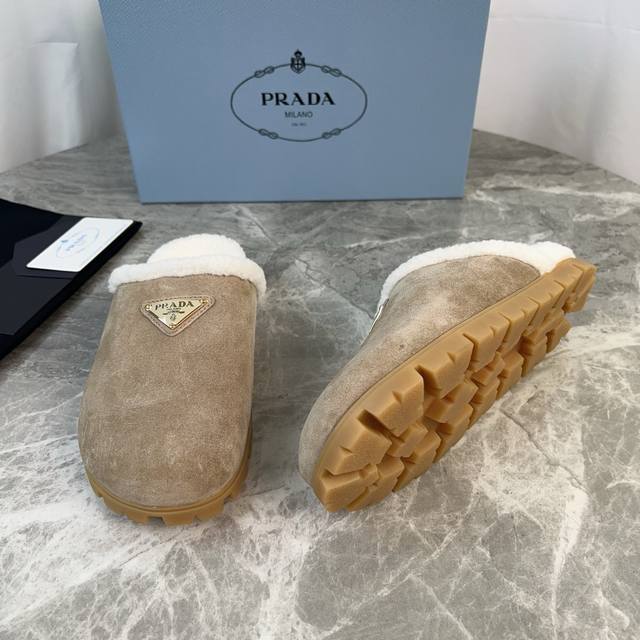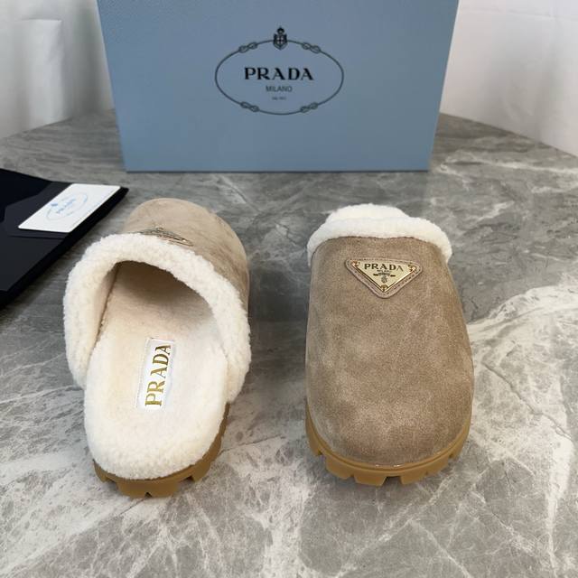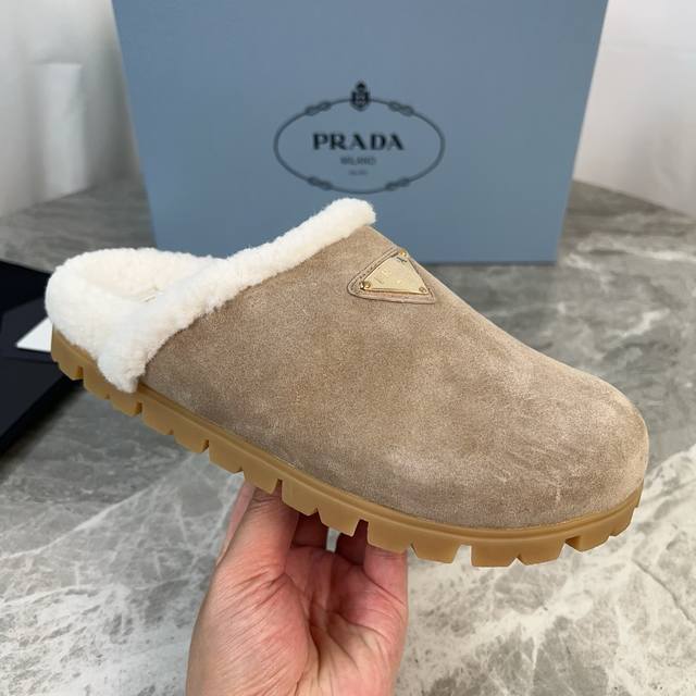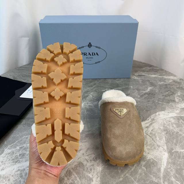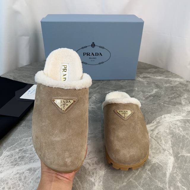 P家最新款毛拖 面:进口高丝光牛反绒 里:进口羊羔毛 垫:羊羔毛 底:原版开模防滑花纹大底 标志性三角标,原版包装 Size :35-41 40、41定制