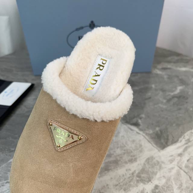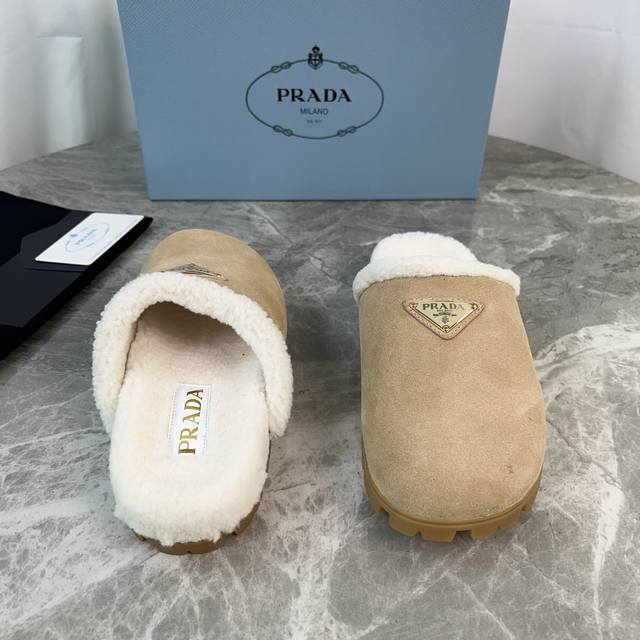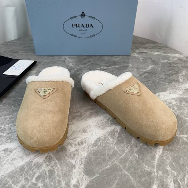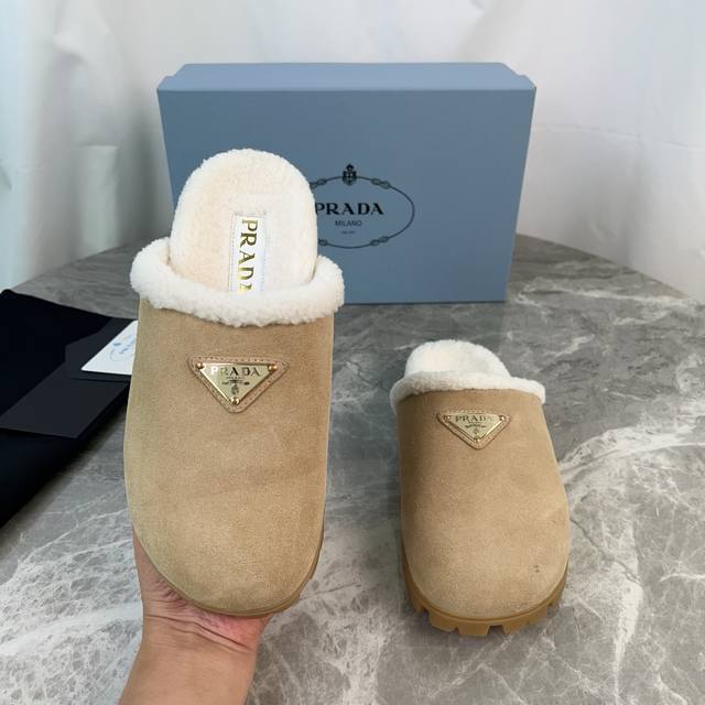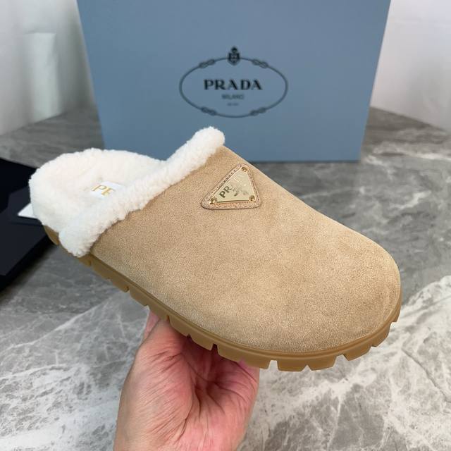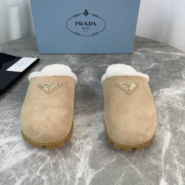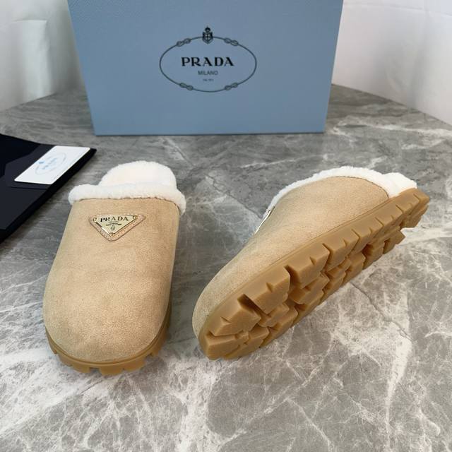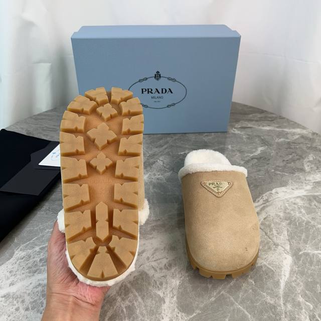 P家最新款毛拖 面:进口高丝光牛反绒 里:进口羊羔毛 垫:羊羔毛 底:原版开模防滑花纹大底 标志性三角标,原版包装 Size :35-41 40、41定制