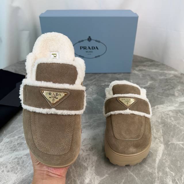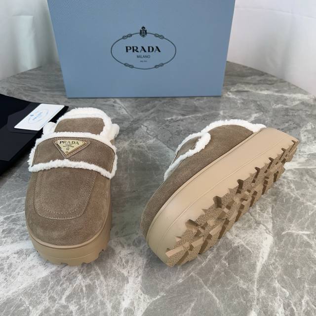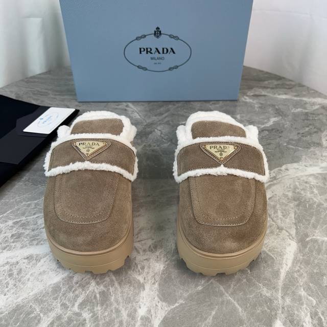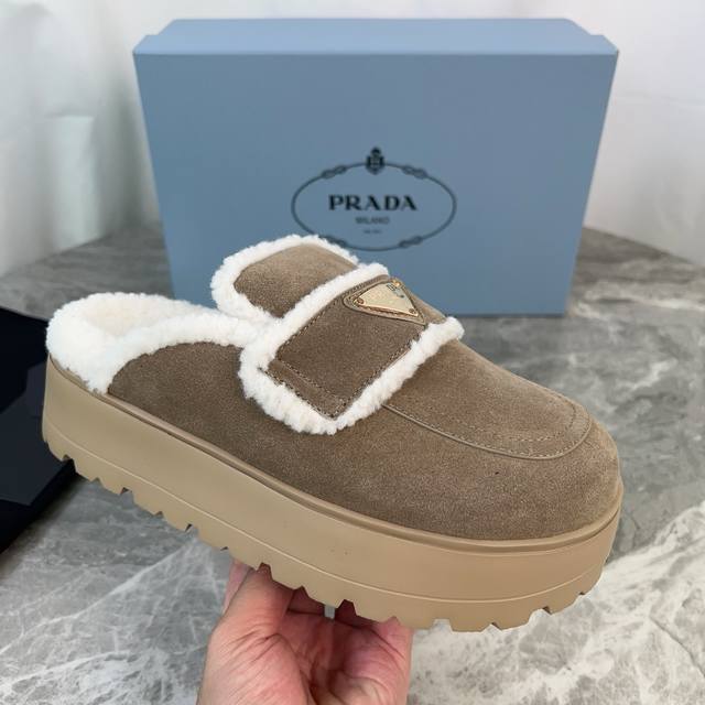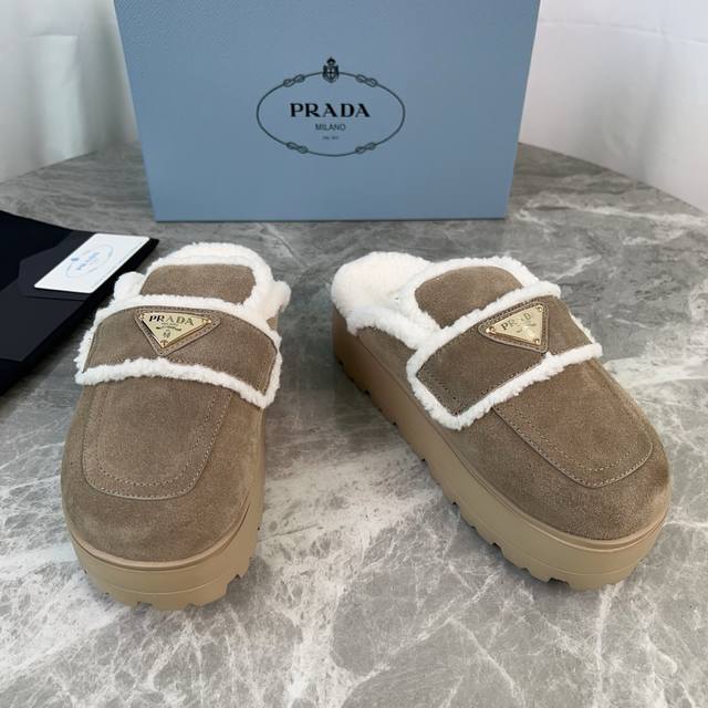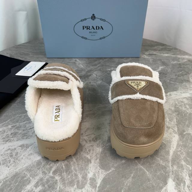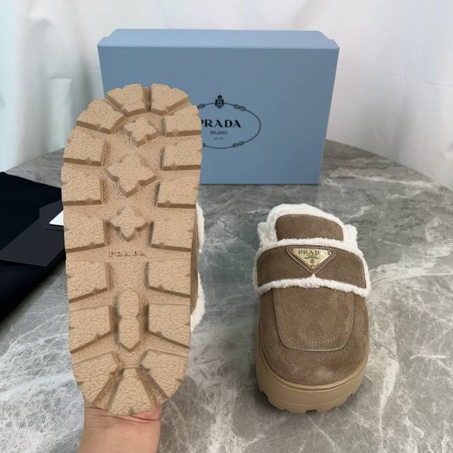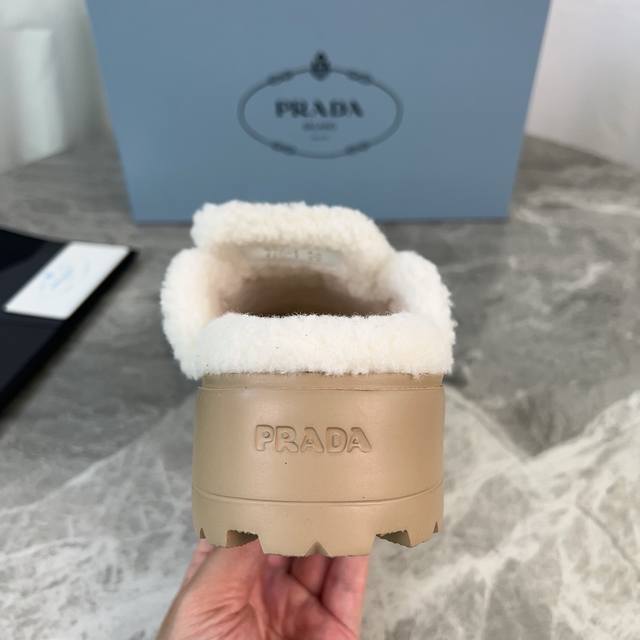 P家最新款毛拖 面:进口高丝光牛反绒 里:进口羊羔毛 垫:羊羔毛 底:超轻橡胶发泡大底 厚6Cm 标志性三角标,原版包装 Size :35-41 40、41定制