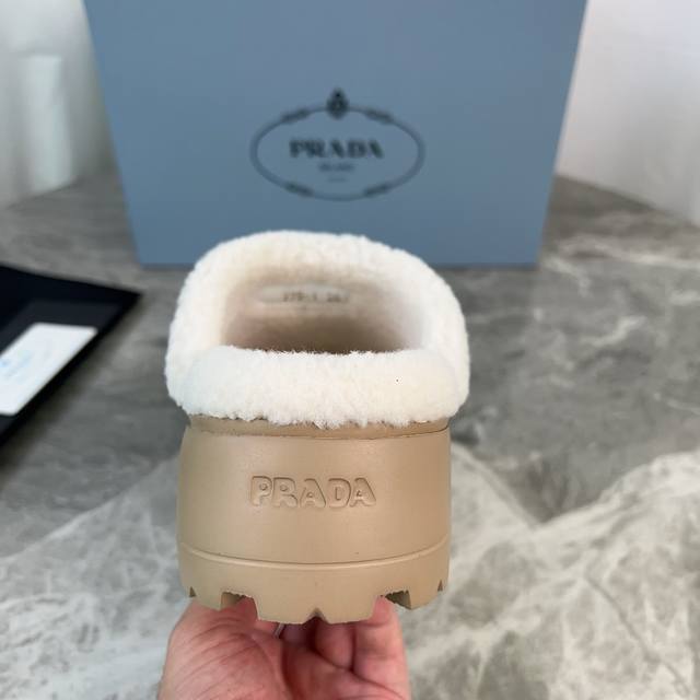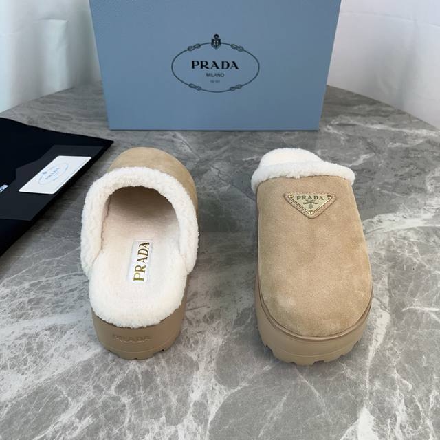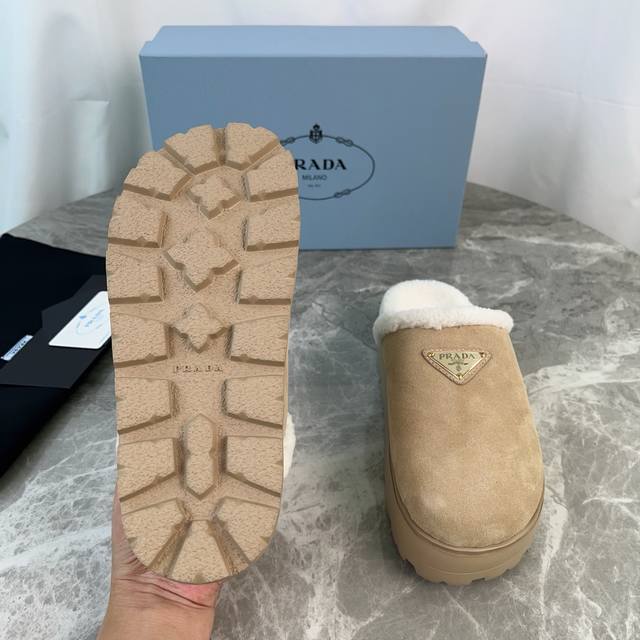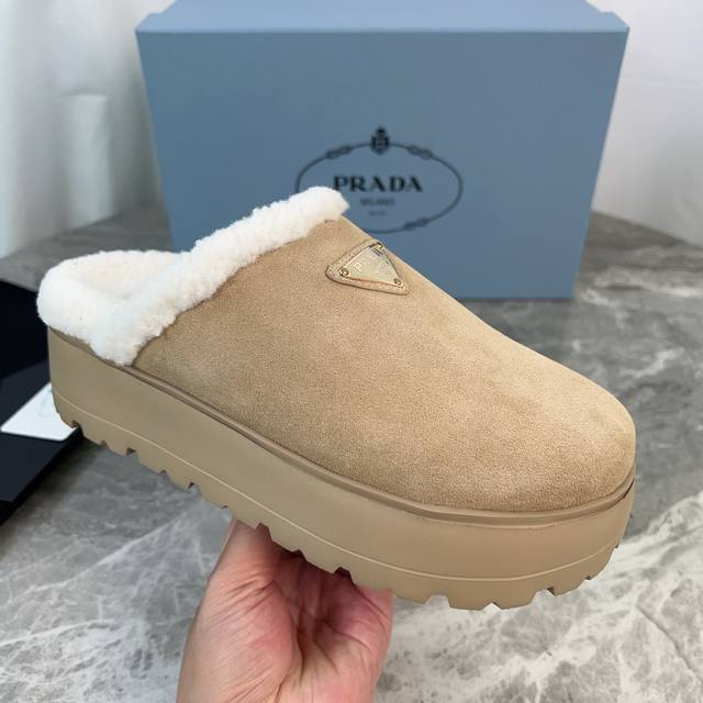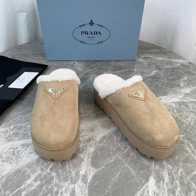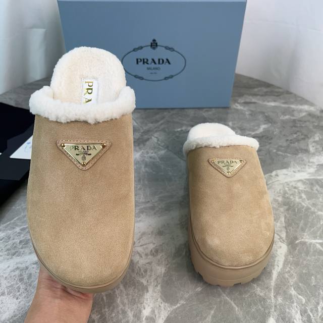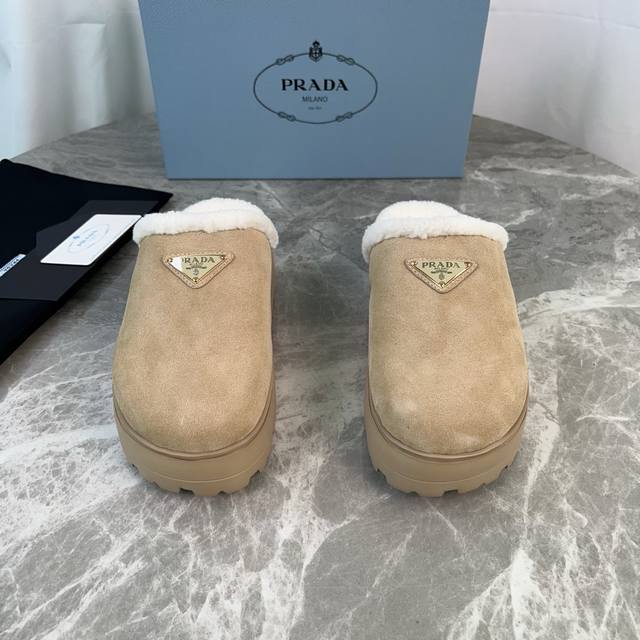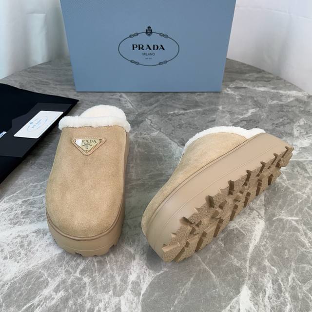 P家最新款毛拖 面:进口高丝光牛反绒 里:进口羊羔毛 垫:羊羔毛 底:超轻橡胶发泡大底 厚6Cm 标志性三角标,原版包装 Size :35-41 40、41定制