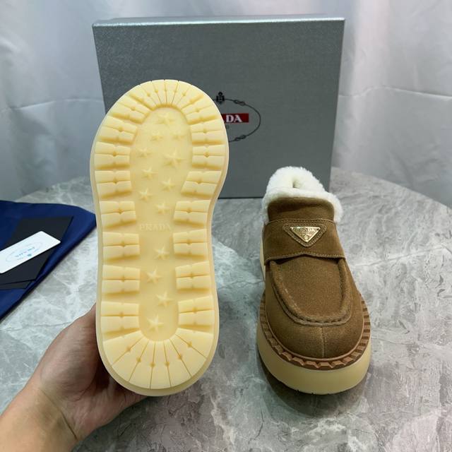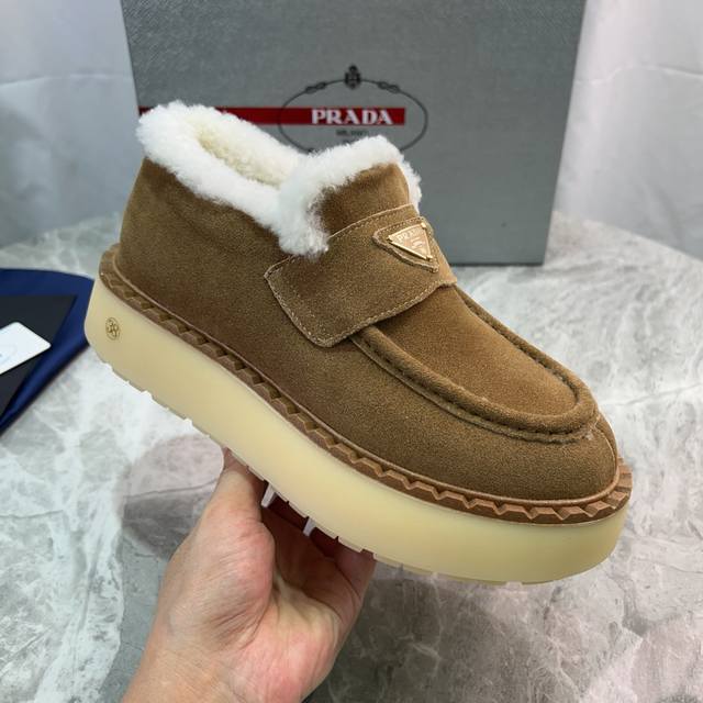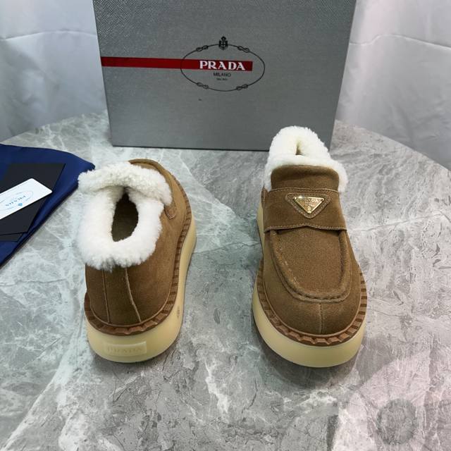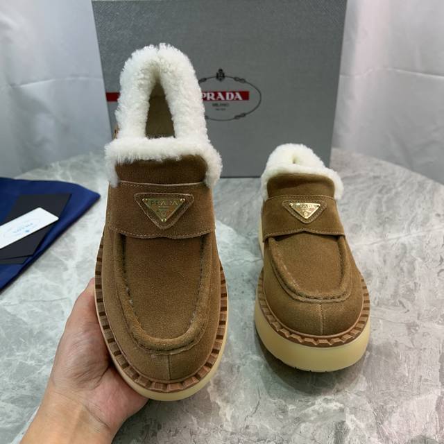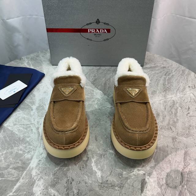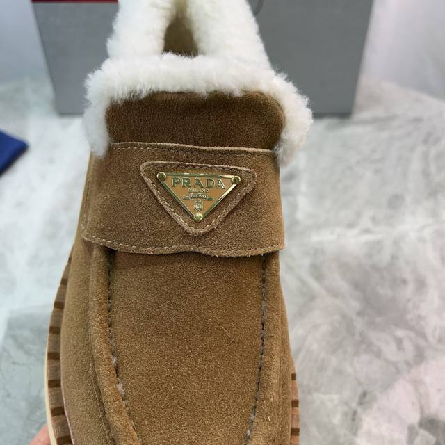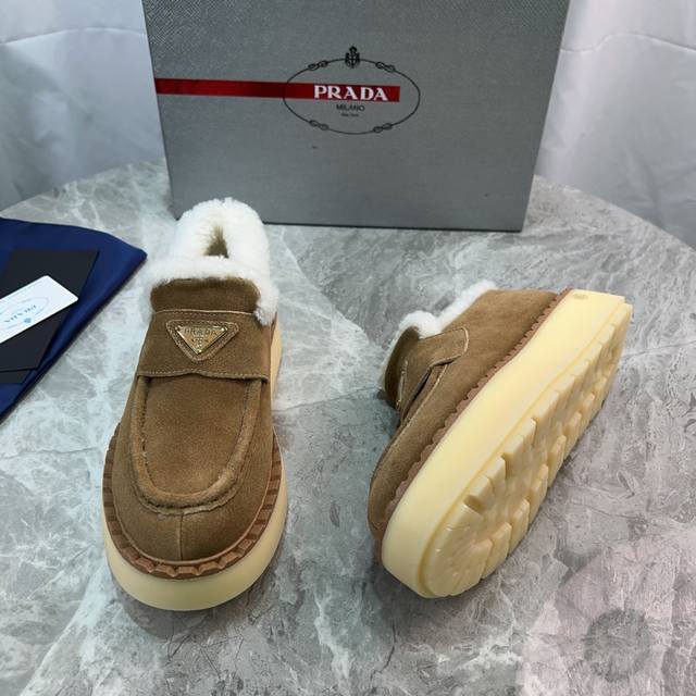 P家最新款毛毛鞋 面:高丝光牛反绒 里:全真羊毛 垫:全真羊毛 底:原版Pu底 经典三角标 Size :35-41 41定做