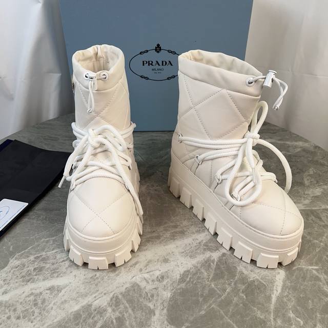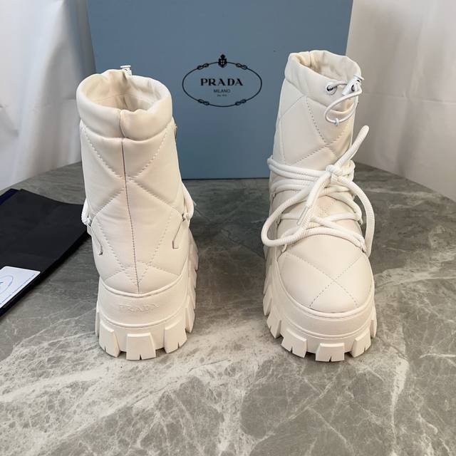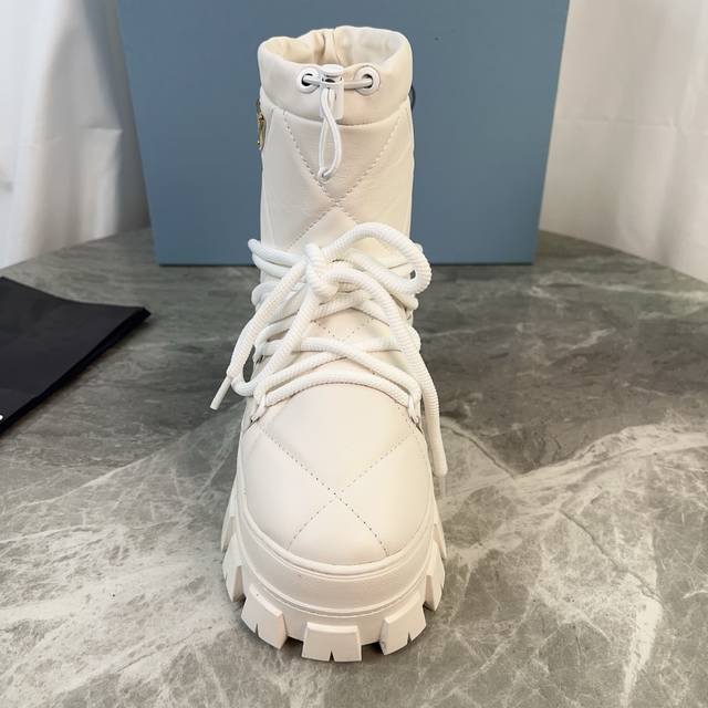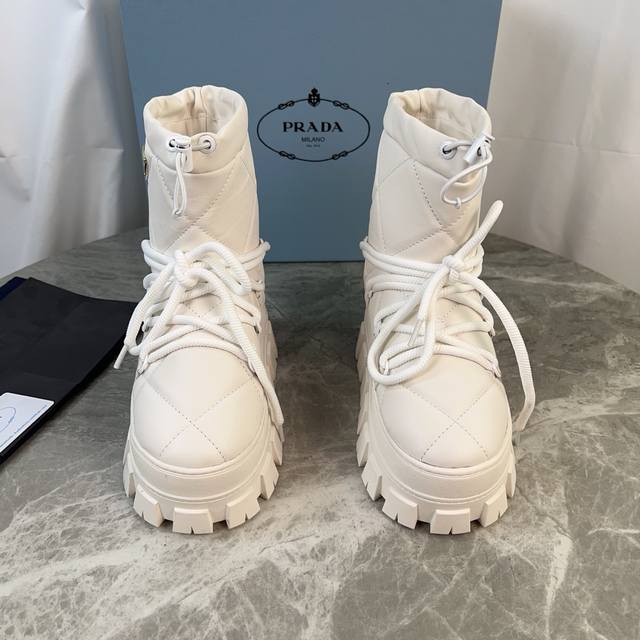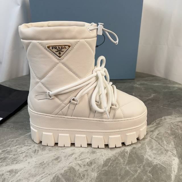 P家最新款,顶级版本。 面:进口超软牛皮、高丝光牛反绒 里:皮毛一体纯真羊毛 垫:纯羊毛 底:防滑花纹橡胶底 厚4.5Cm 标志性三角标,原版包装 Size:35-42