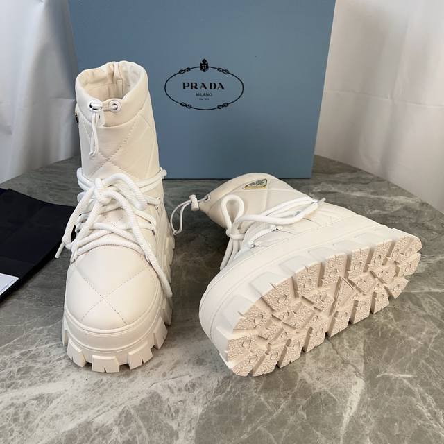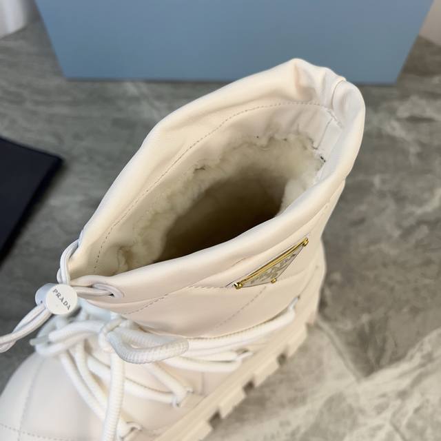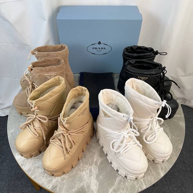 / P家最新款,顶级版本。 面:进口超软牛皮、高丝光牛反绒 里:皮毛一体纯真羊毛 垫:纯羊毛 底:防滑花纹橡胶底 厚4.5Cm 标志性三角标,原版包装 Size:3