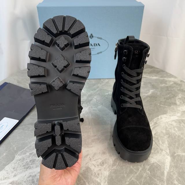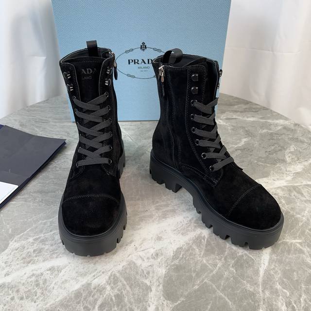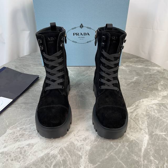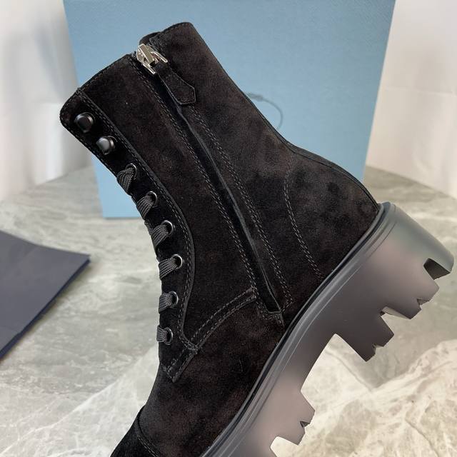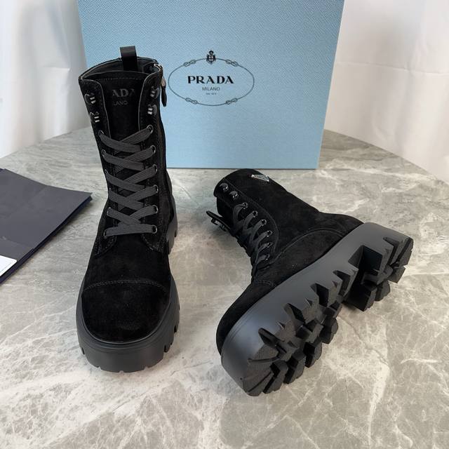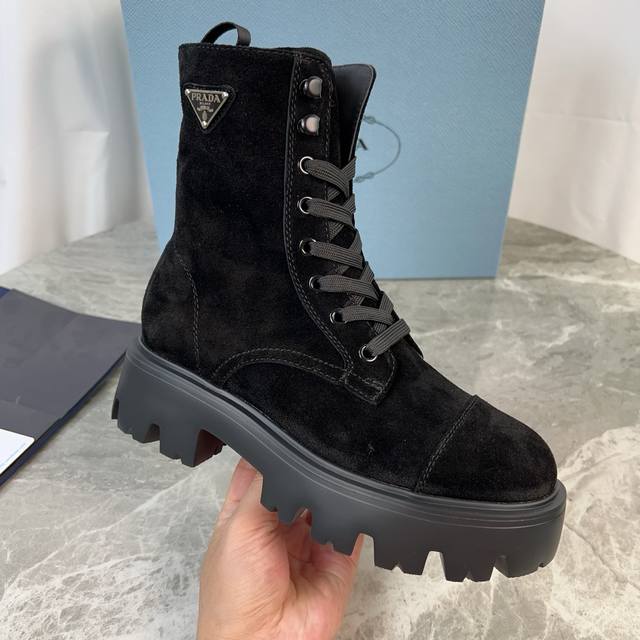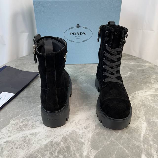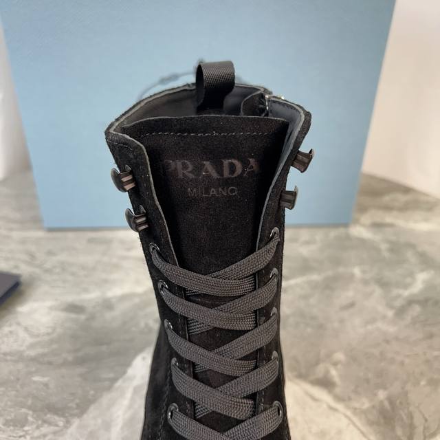 / P家最新款 面:进口全粒面牛皮、高丝光牛反绒 里:进口小牛皮 垫:进口小牛皮 底:原版工艺大底 厚6Cm 标志性三角标,原版包装 Size:35-42 41.4