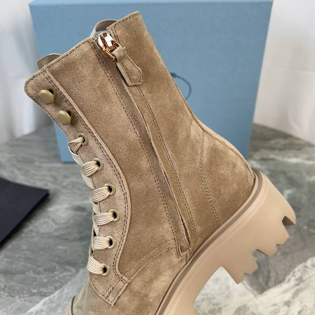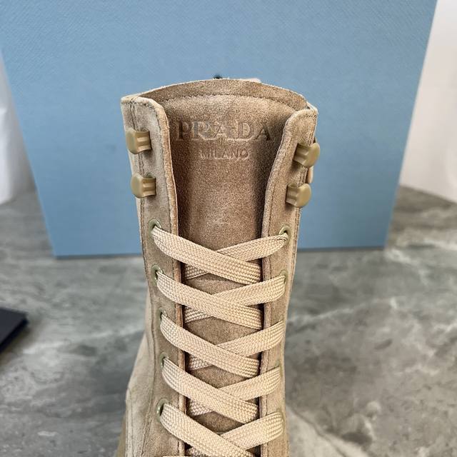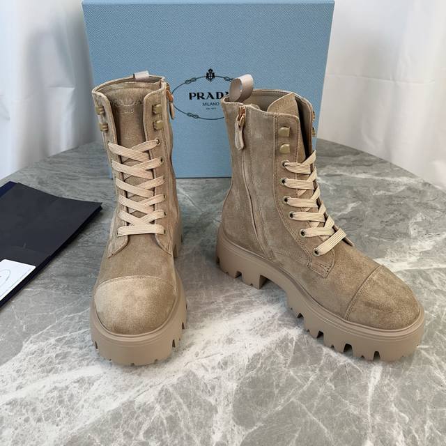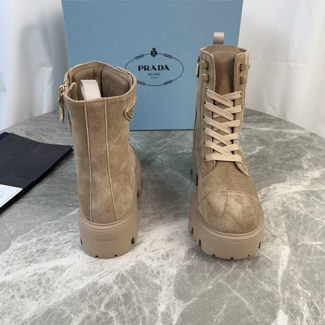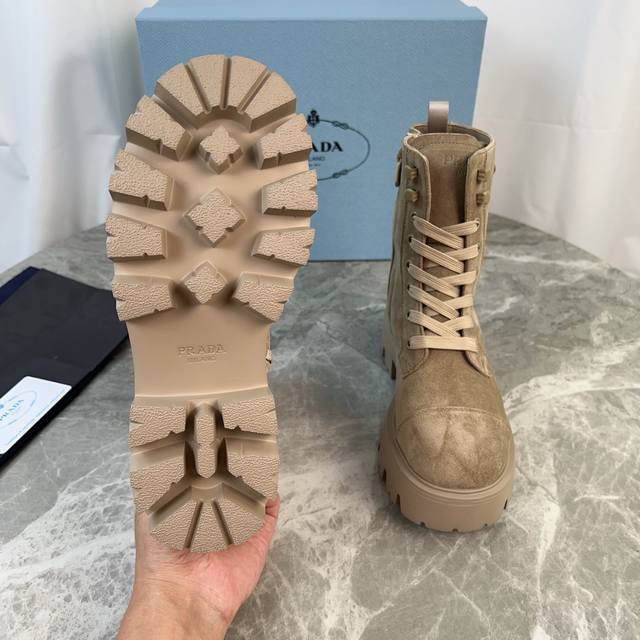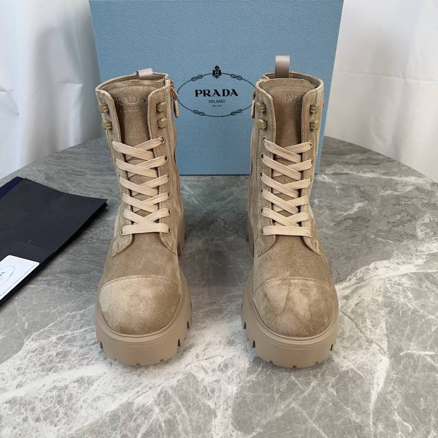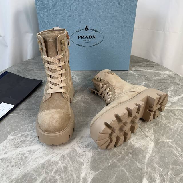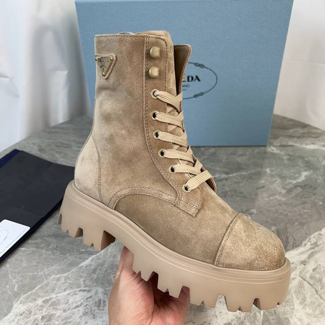 P家最新款 面:进口全粒面牛皮、高丝光牛反绒 里:进口小牛皮 垫:进口小牛皮 底:原版工艺大底 厚6Cm 标志性三角标,原版包装 Size:35-42 41.42定制