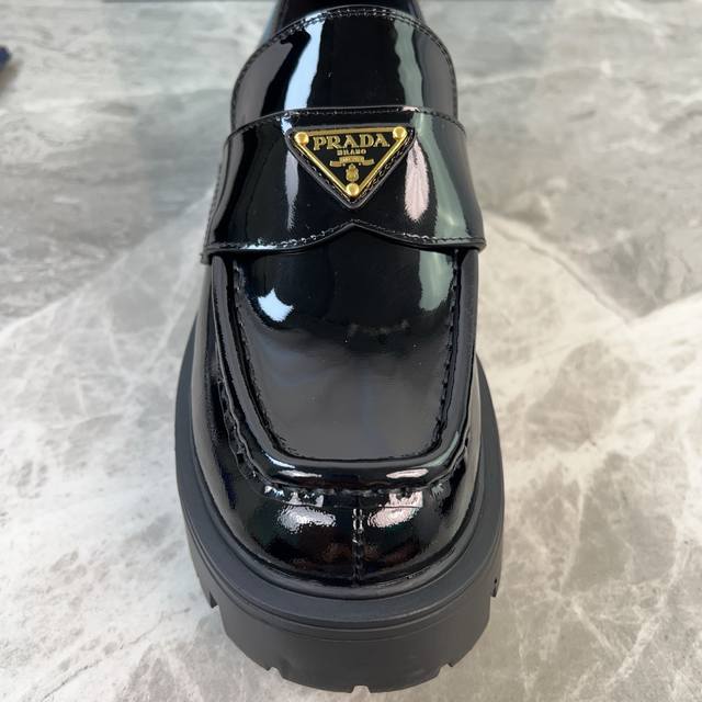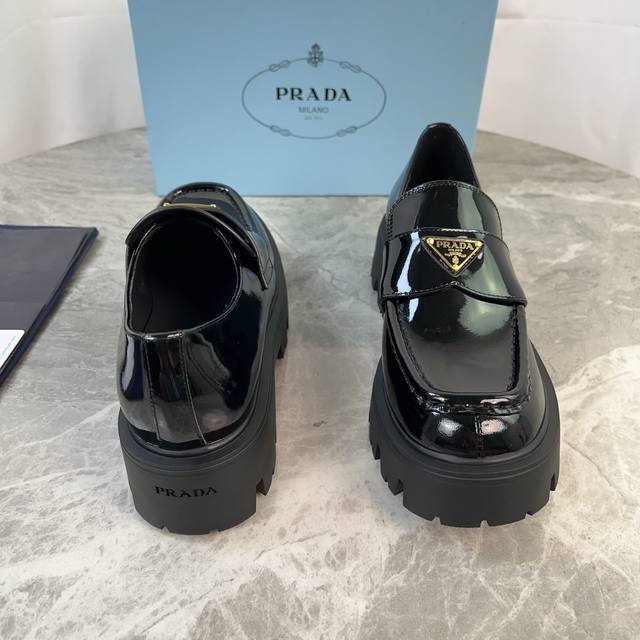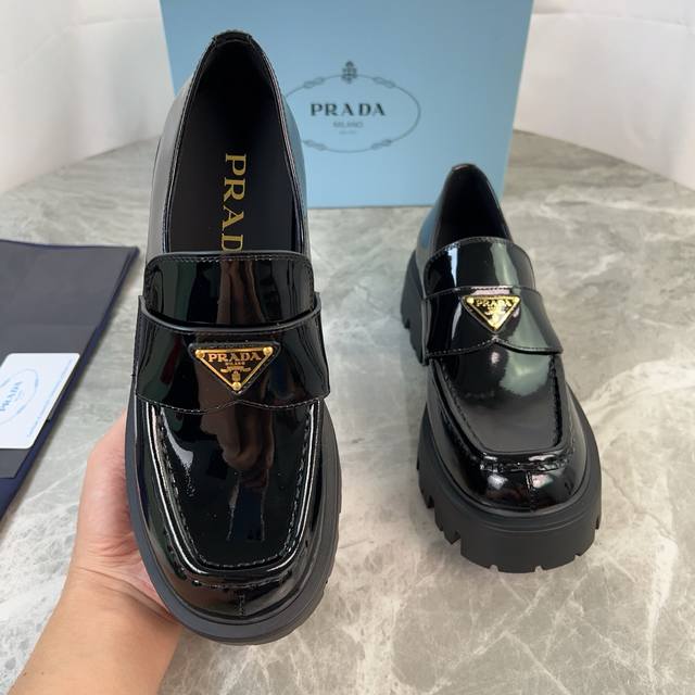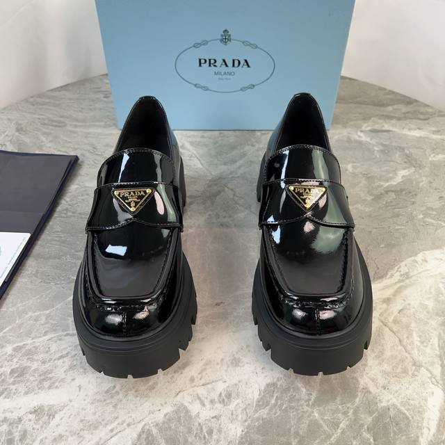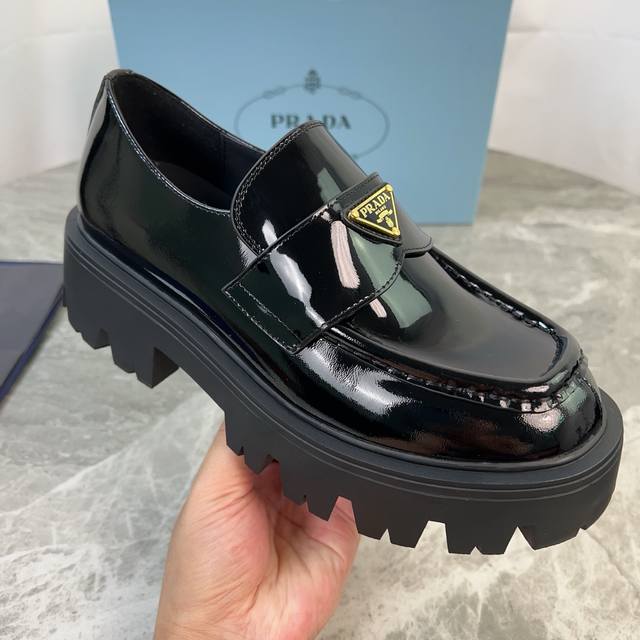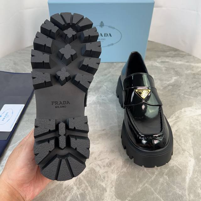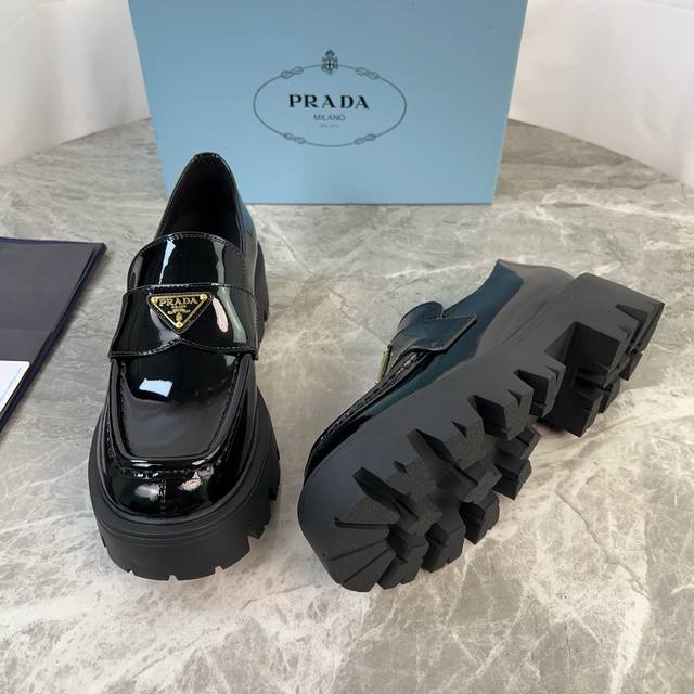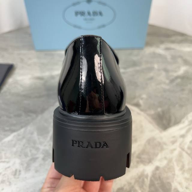 P家最新款 面:进口开边珠、牛漆皮、高丝光牛反绒 里:进口小牛皮 垫:进口小牛皮 底:原版工艺大底 厚6Cm 标志性三角标,原版包装 Size:35-42 41.42定制